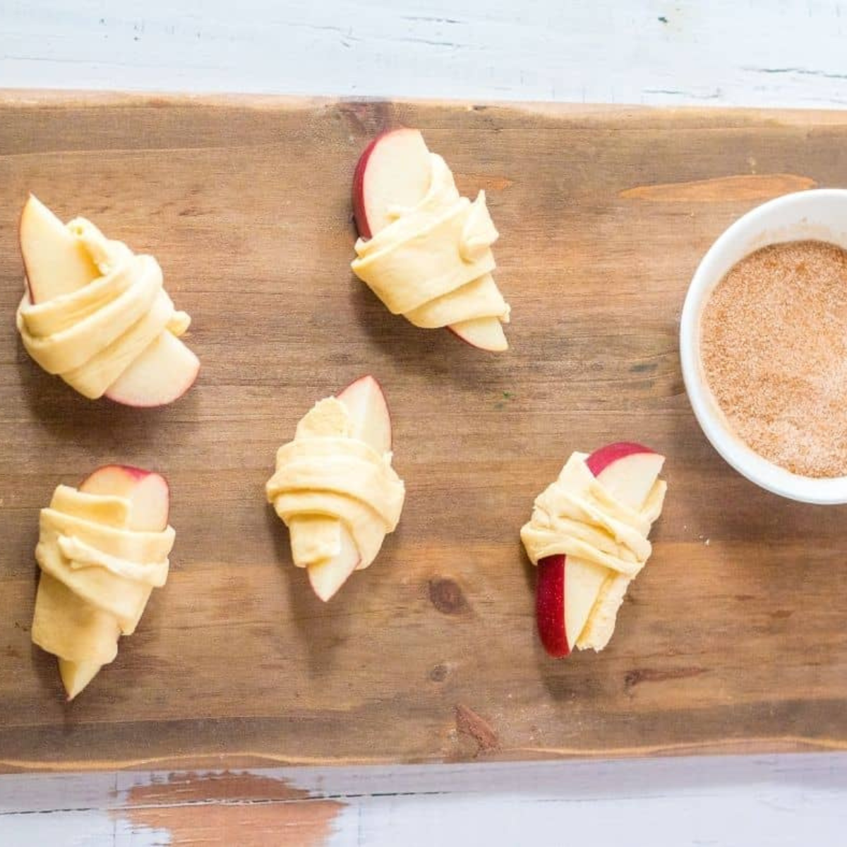 Step One: Slice each apple into 8 pieces. Cut each crescent triangle in half lengthwise to make two smaller triangles, place an apple slice on each, and carefully roll them up.