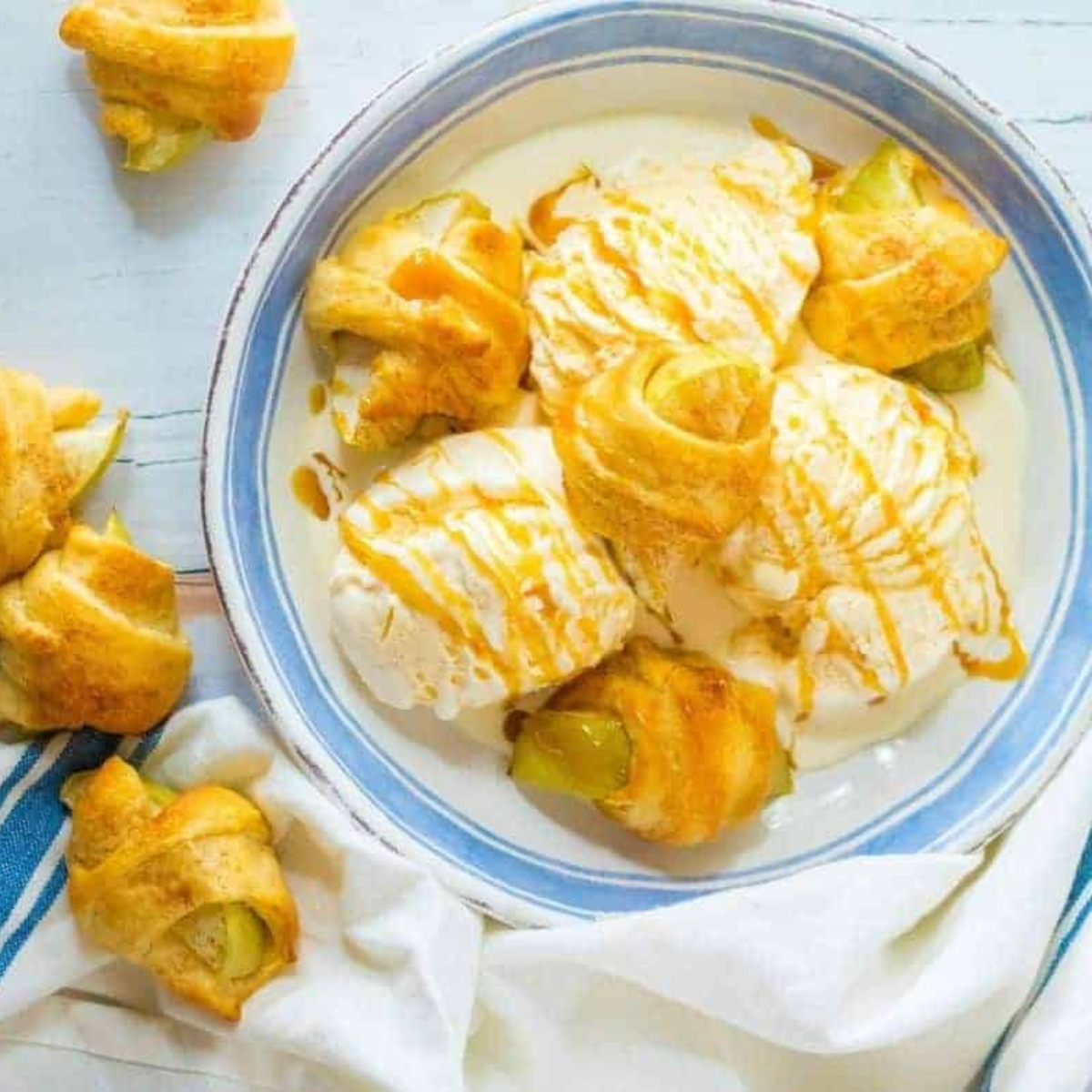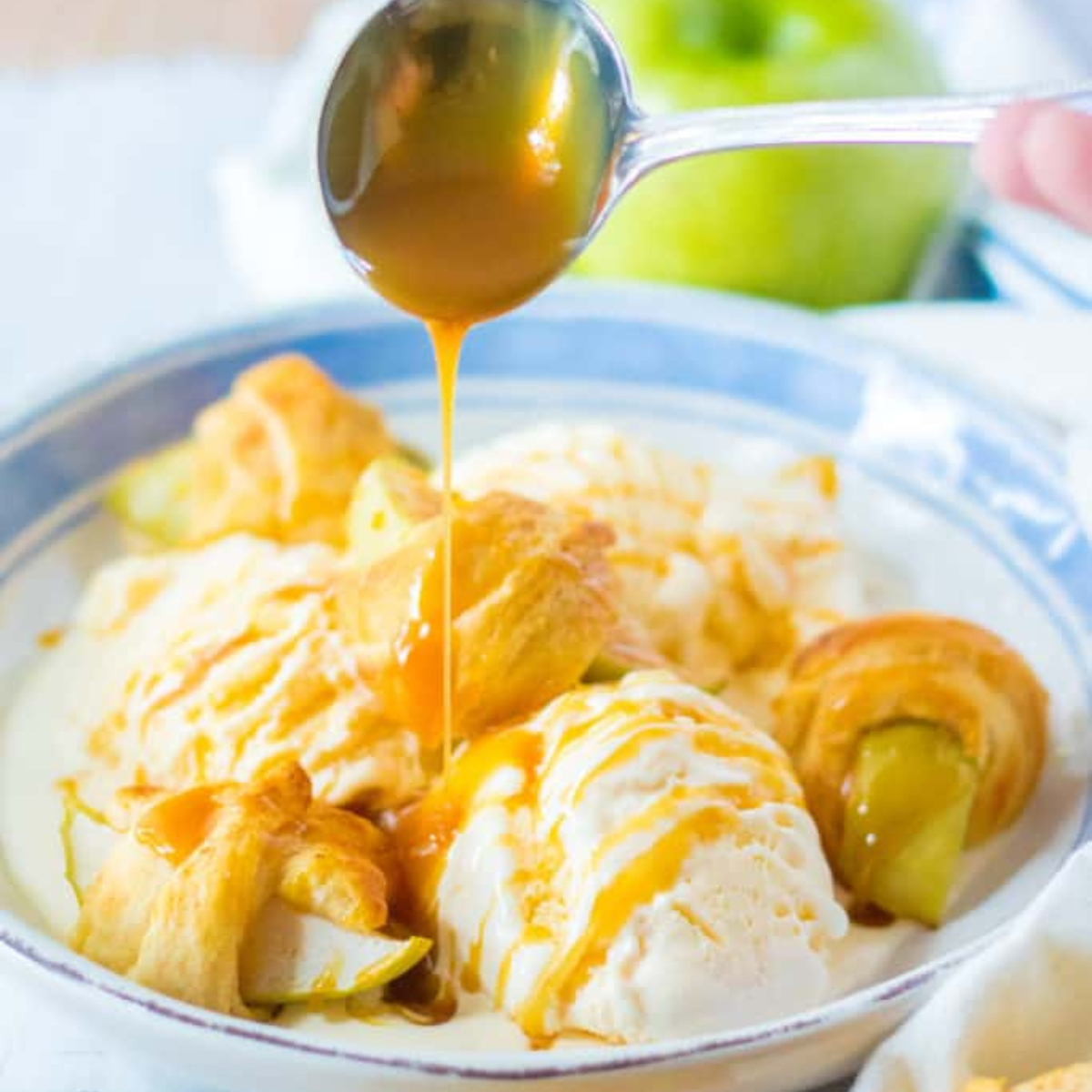 Step Four: Air fry the crescents at air fryer temperature of 320 degrees F and set cook time for 6-8 minutes, checking at 5 minutes to avoid overcooking. Serve warm, optionally over ice cream with a drizzle of caramel sauce.