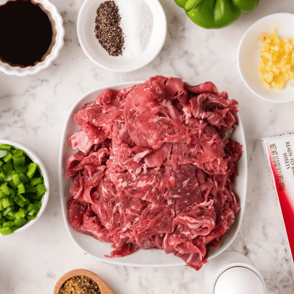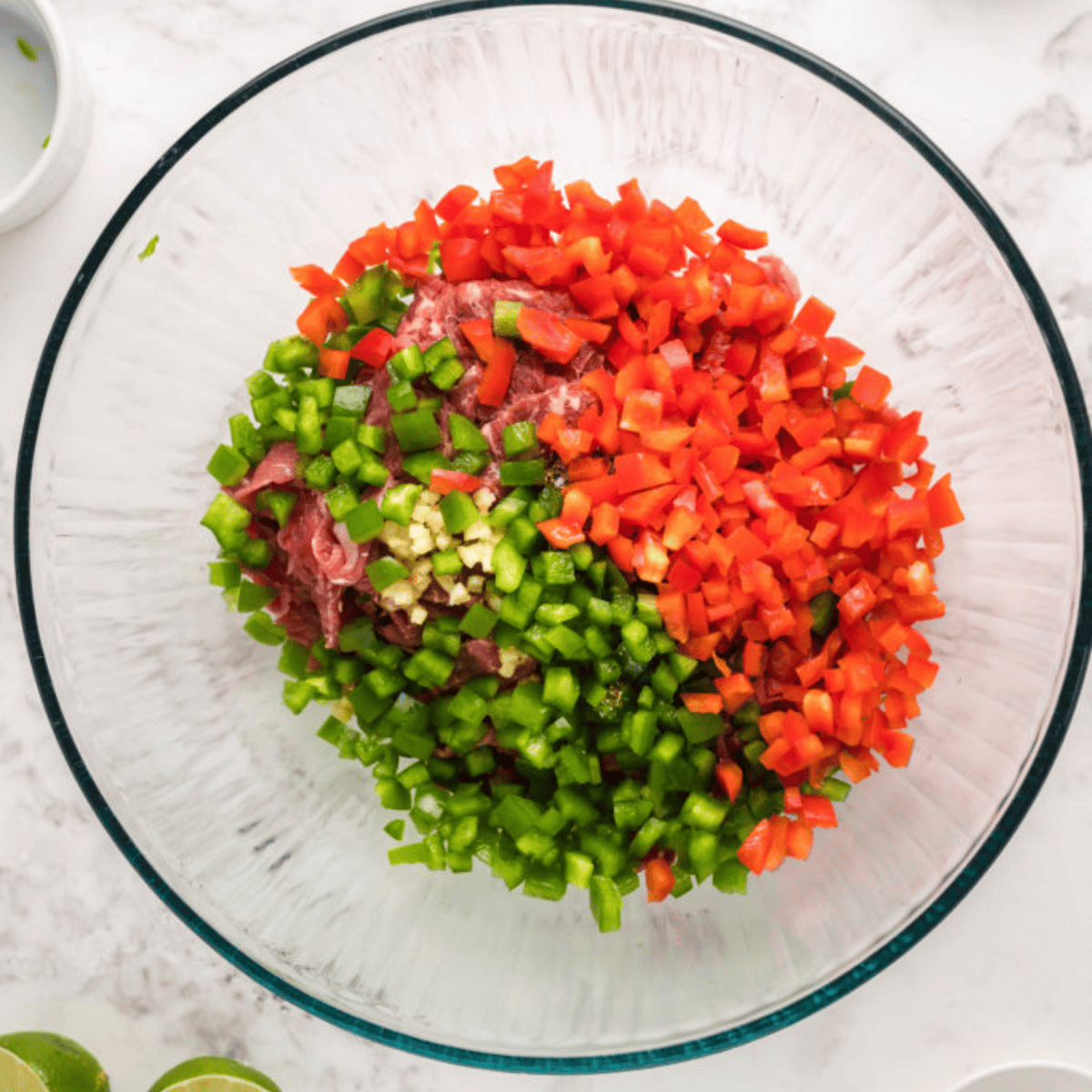 - In a large mixing bowl, combine 1/2 pound shaved ribeye steak, 2 tablespoons Worcestershire Sauce, 2 teaspoons minced garlic, 1 teaspoon sea salt, 1/2 teaspoon black pepper, 1 tablespoon lime juice 1 cup onions1 cup green bell pepper, and 1 cup red bell pepperToss to evenly distribute sauce and seasoning. Add to an 8-inch baking dish.