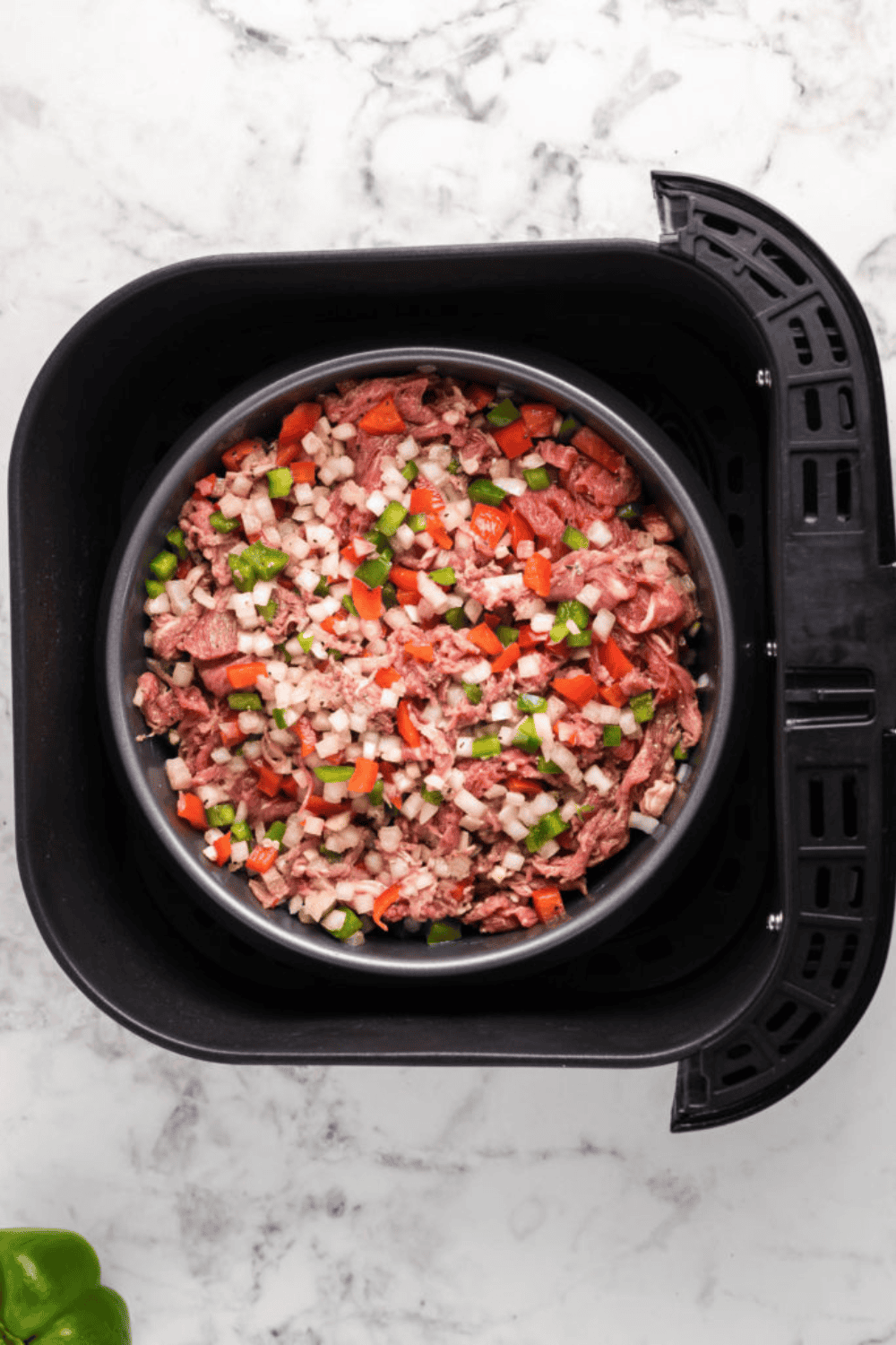 Do I need to pre-cook the vegetables? No, the onions and bell peppers cook quickly inside the air fryer along with the beef.