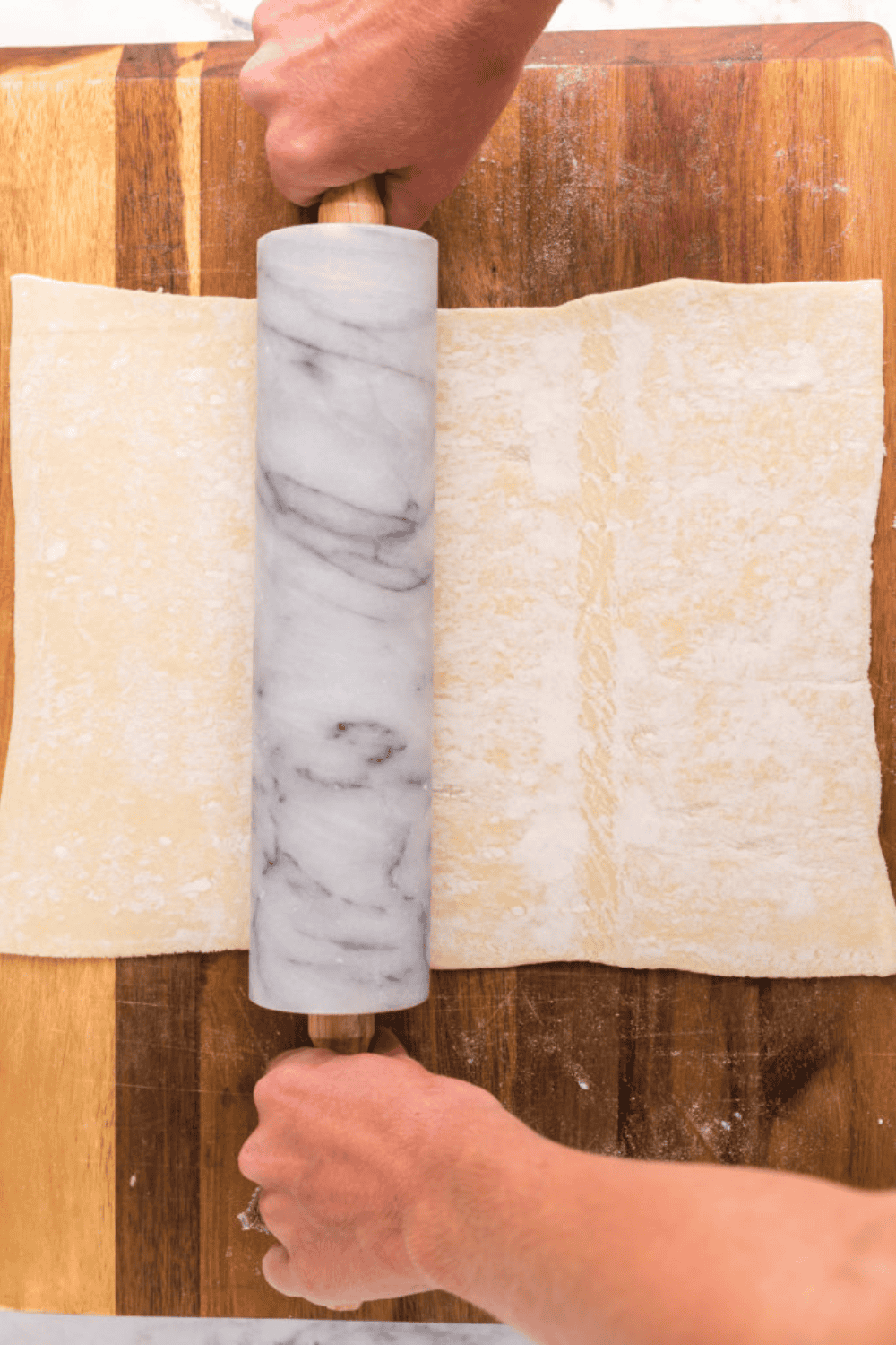 Step Three: Preheat the air fryer to 375°F for 5 minutes. On a lightly floured wooden board, roll out the puff pastry sheet until smooth and even.