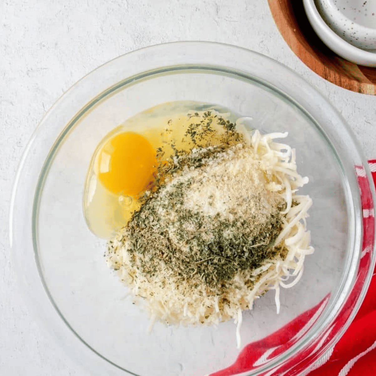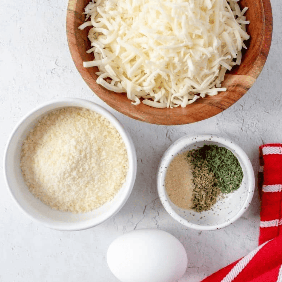 - Spray a baking or pizza pan with non-stick cooking spray. Mix the 1 cup mozzarella cheese, grated 1/3 cup Parmesan cheese, 1 large egg, 1/4 teaspoon Italian seasoning, 1/4 teaspoon garlic powder and 1/2 teaspoon parsley in a large mixing bowl.