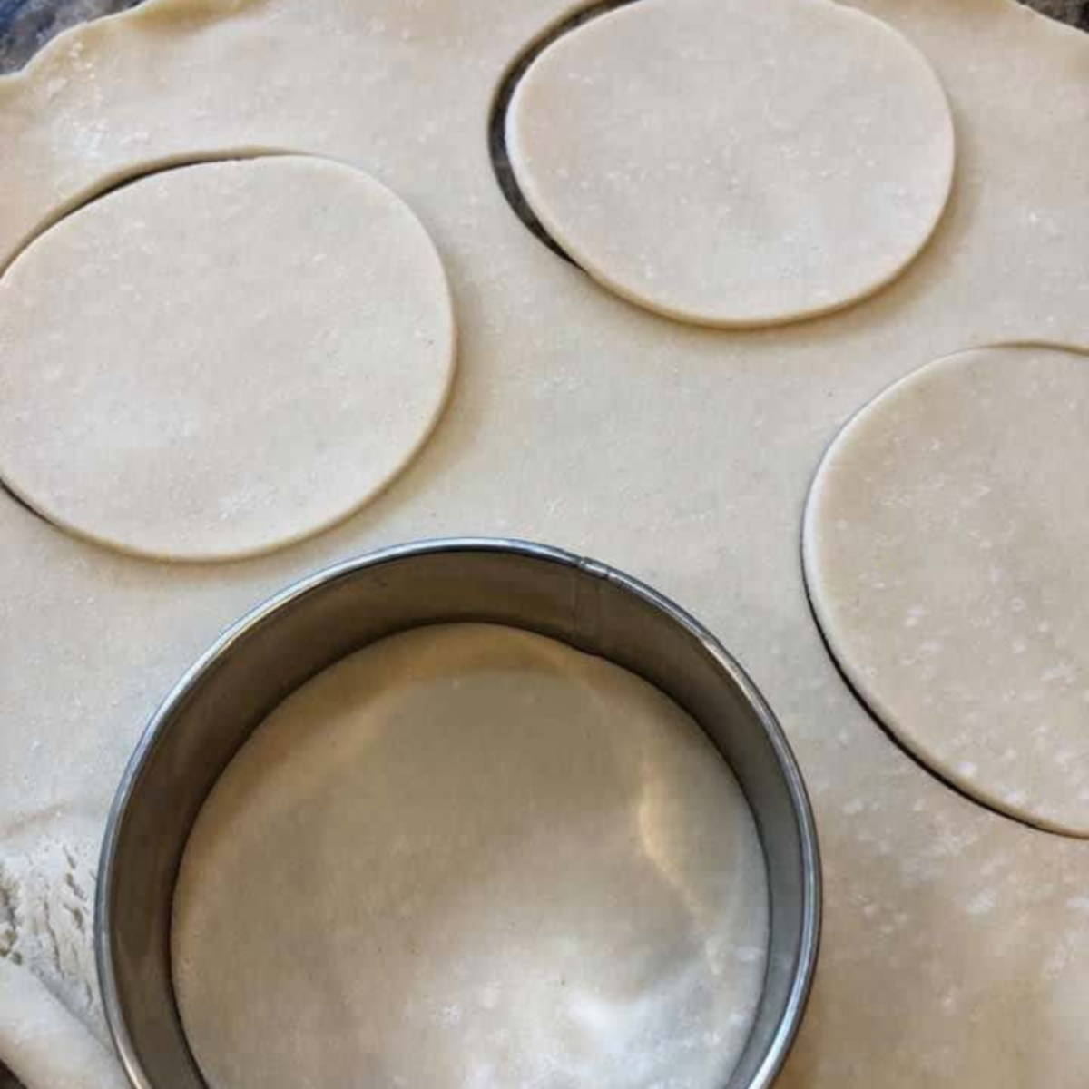 Step Three: Roll out your dough on a lightly floured surface; if needed, roll your dough with a rolling pin. Then cut your dough out with biscuit cutters; cut them larger than the muffin tin hole to cover the sides. The size will depend on the muffin tin you are using, I used a 6-inch biscuit cutter.