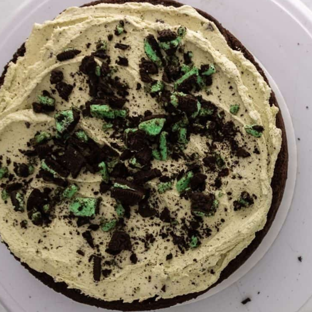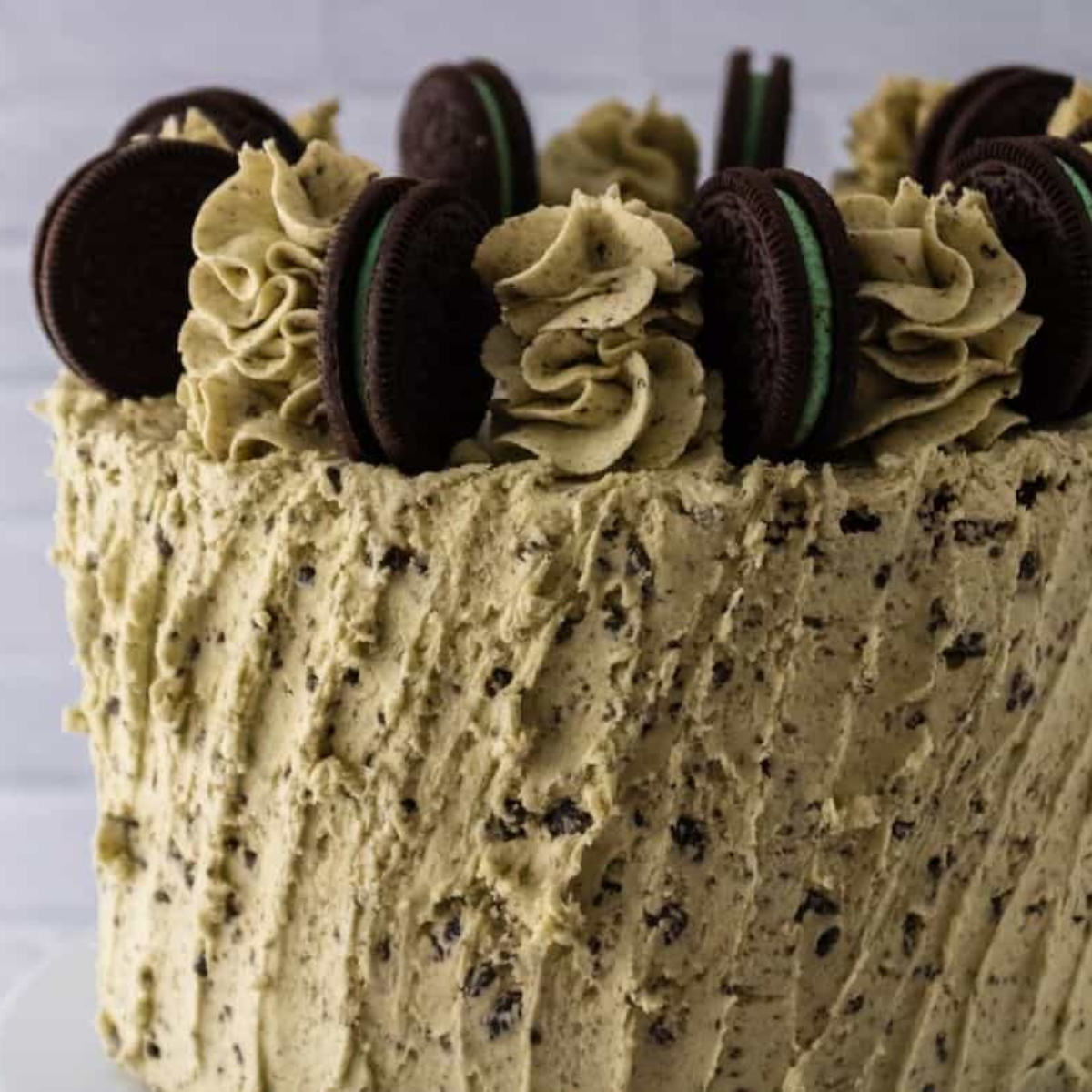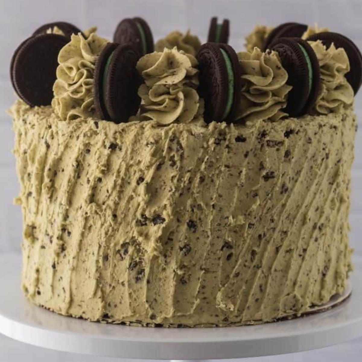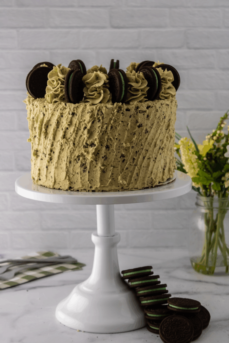 - Smooth out the top of the cake with your offset spatula. Add additional frosting to a piping bag fitted with a 1M tip. Place Mint Oreos around the top of the cake and fill in the gaps with piped buttercream.