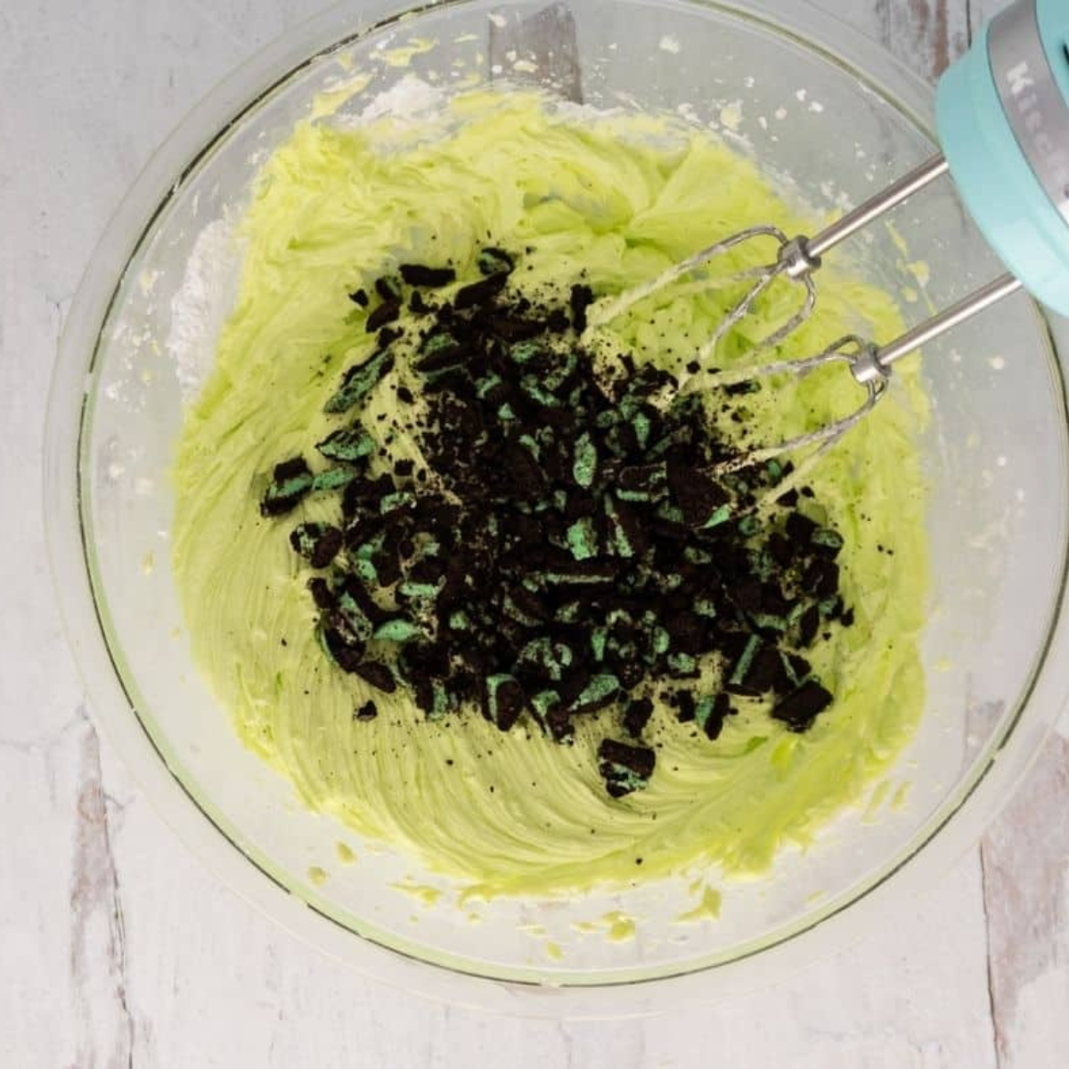 - Finely chop 6-8 mint Oreos, add to the frosting, and add half of the remaining heavy cream. Mix on high for 5-7 mins, the frosting will double in size, the color will lighten, and the texture will become silky. Only add the last .05 tbsp of liquid if needed.