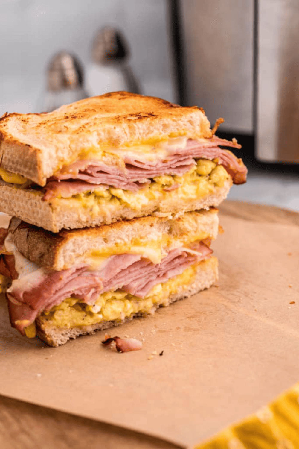 This is the best sandwich ever in the air fryer. I’ve made it with bacon, ham, sausage and bologna. They’re all yummy.