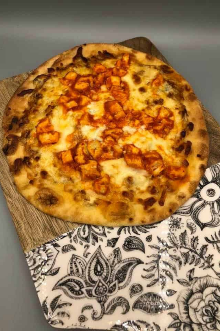 Crispy naan is topped with tender buffalo chicken, gooey melted cheese, and your favorite ranch or blue cheese drizzle for the ultimate flavor combo.