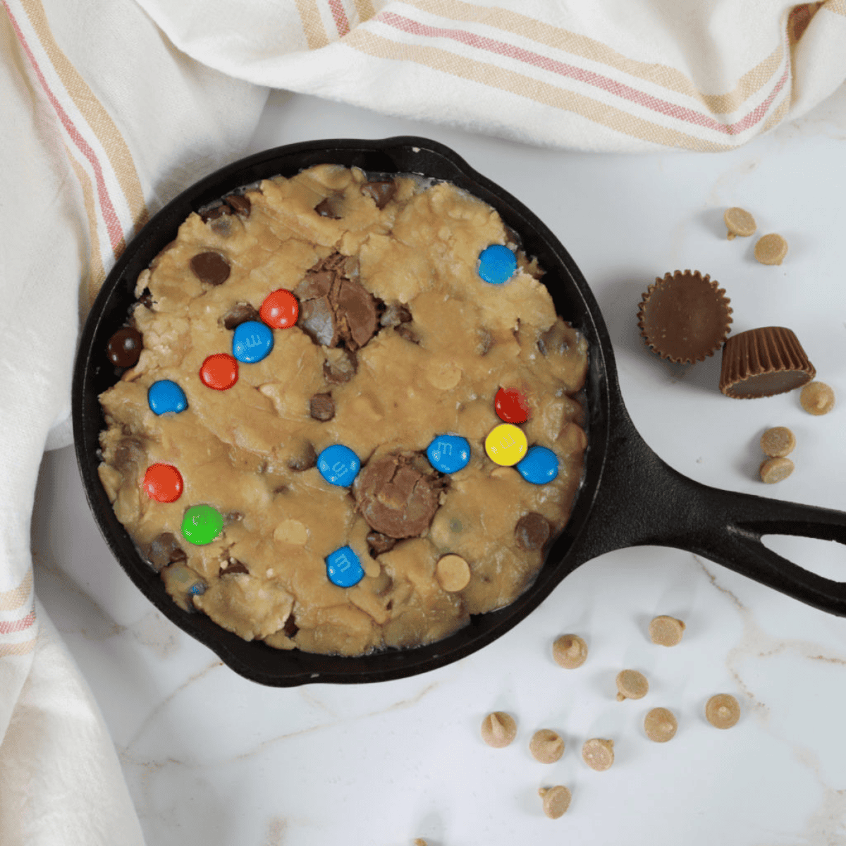 - Add the 1 1/2 cup all-purpose flour, 1/2 teaspoon baking powder, 1/2 teaspoon salt, 1/2 cup butter, 1/2 cup granulated sugar, 1/2 cup brown sugar, 1 large egg, and 1 teaspoon pure vanilla extract in a large bowl. Mix until everything is well combined, then fold in the 1 1/4 cups chocolate chips, 1/3 cup peanut butter baking chips, 1/4 cup Peanut Butter M&Ms, and 1/4 cup Mini Reese Cups.
