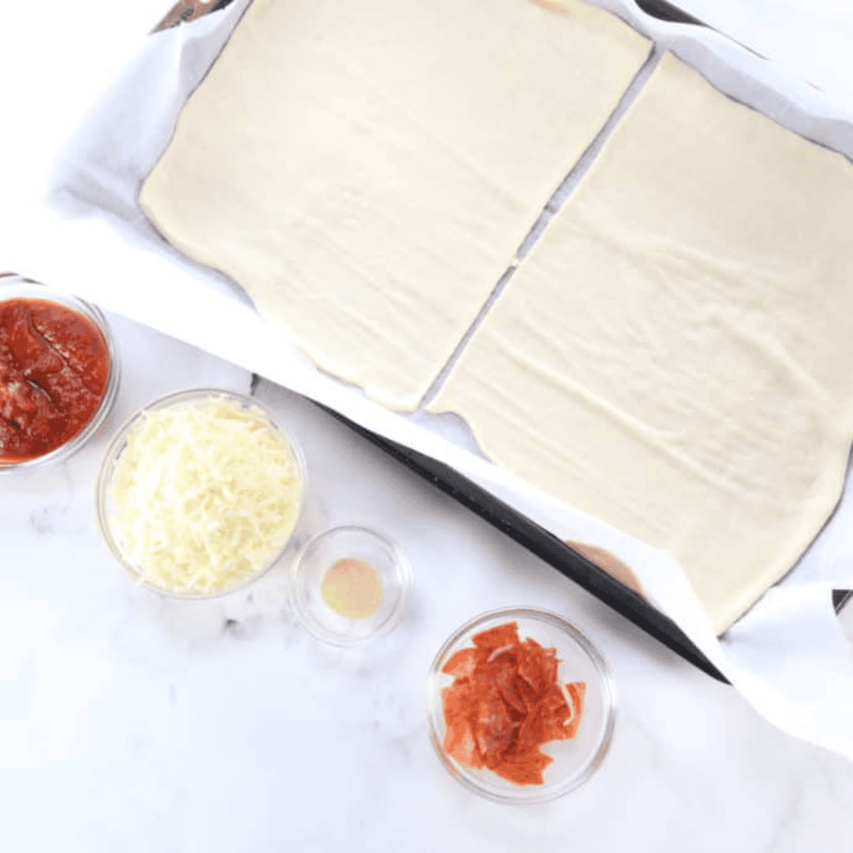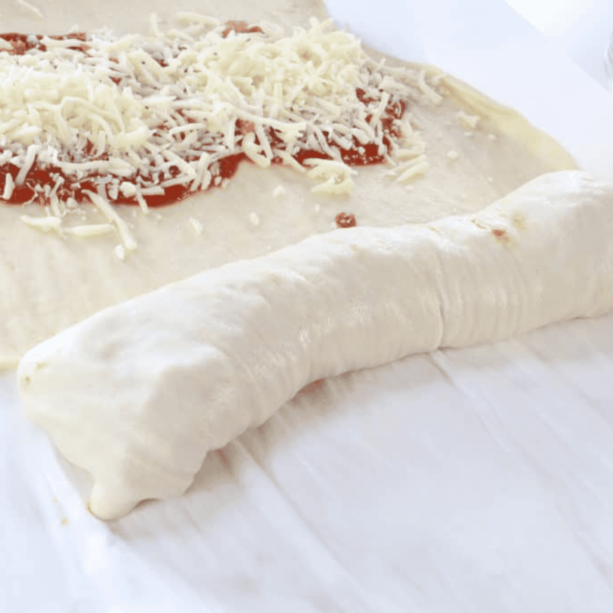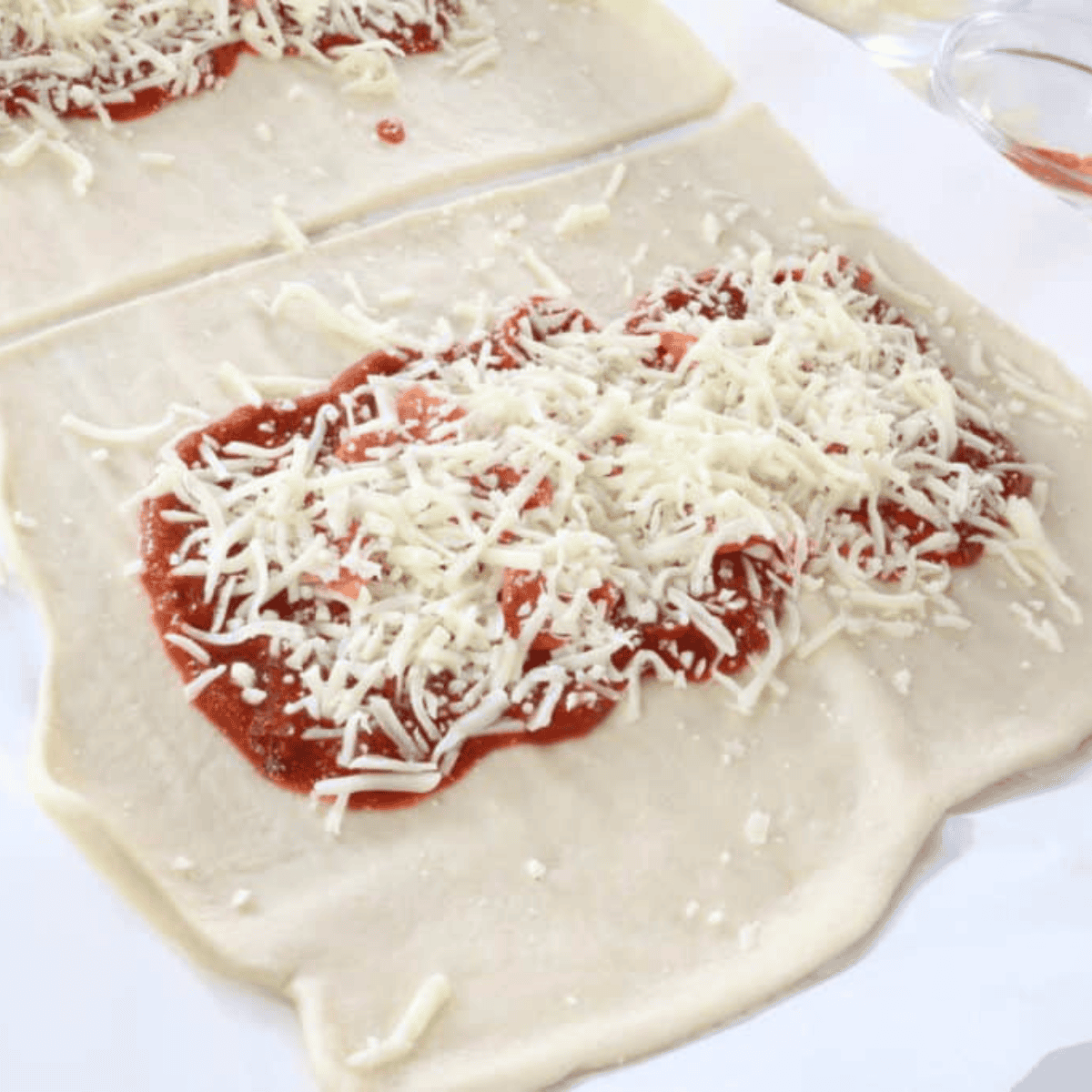 Step 2: Spread 2–3 tablespoons of pizza sauce evenly over the center of the dough. Sprinkle shredded mozzarella cheese over the sauce.