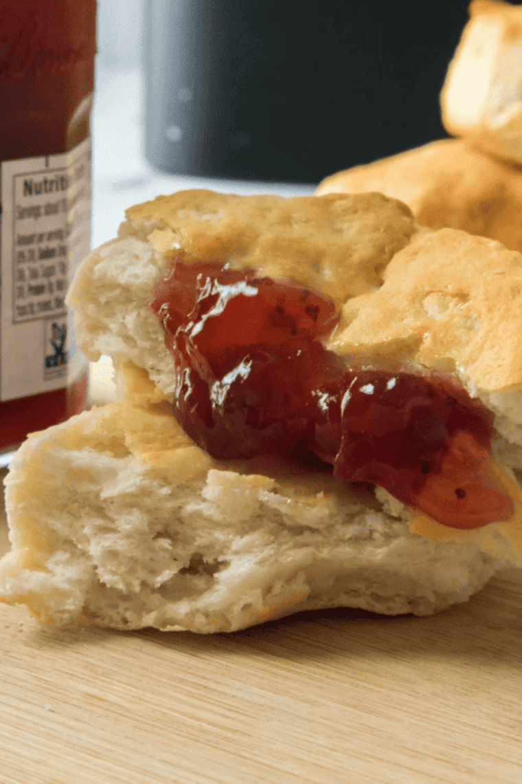 Biscuits are done when they’re golden brown on both sides and a toothpick inserted in the center comes out clean. If the center still feels doughy, add 1–2 minutes. Brush with melted butter immediately after removing from the basket for the best flavor.