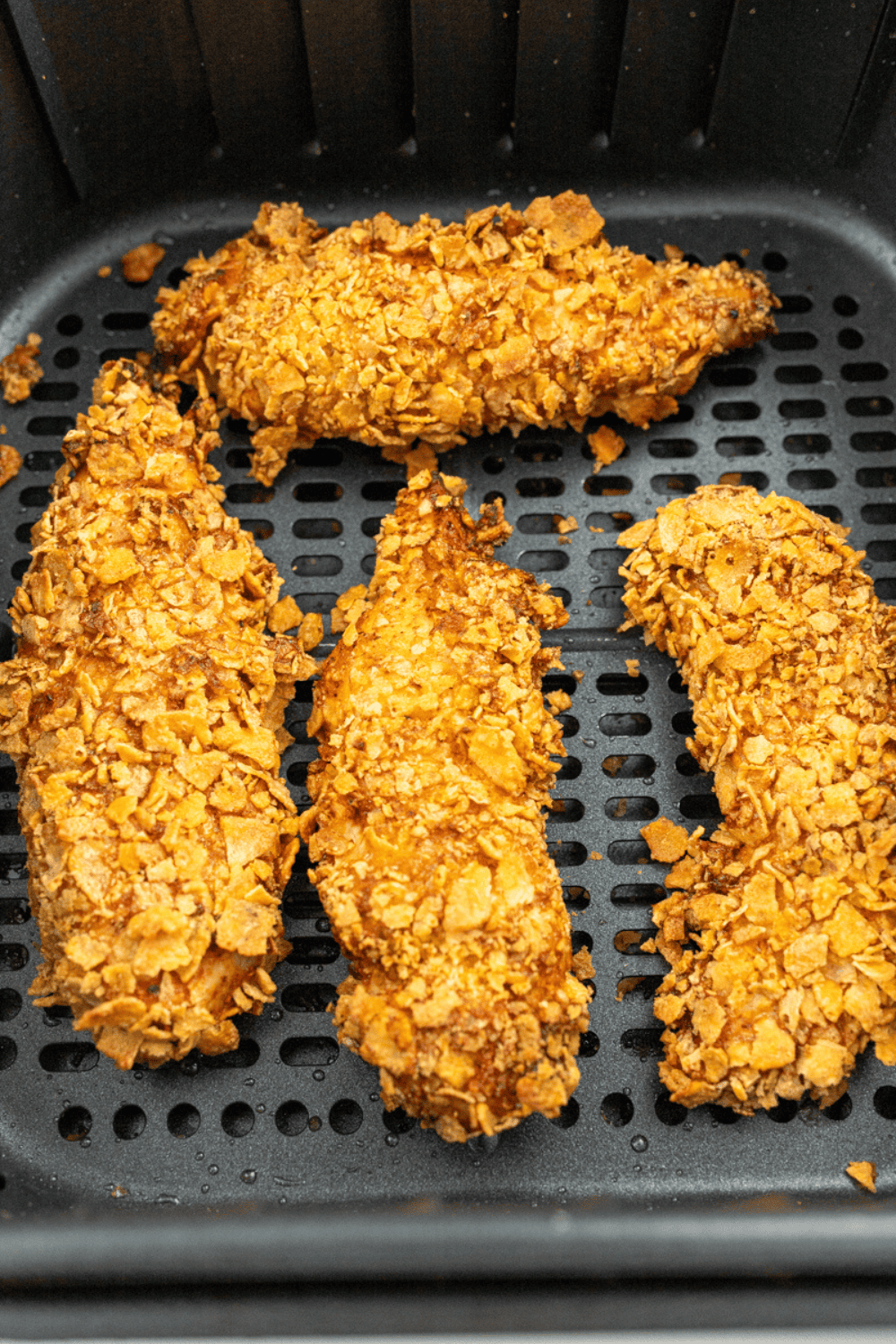 • Air fry at 400°F for 5–6 minutes. Flip each tender, spray the tops again, and cook for another 5–6 minutes until golden and crispy.