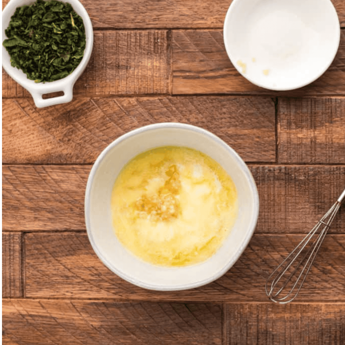 Step Three: Melt the butter in a small bowl. Add minced garlic and dried parsley to the bowl and stir to combine. Brush the melted butter over the dough nuggets.