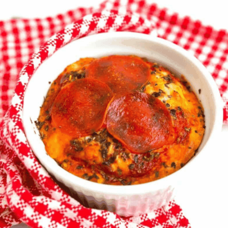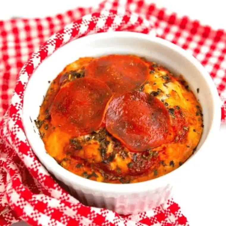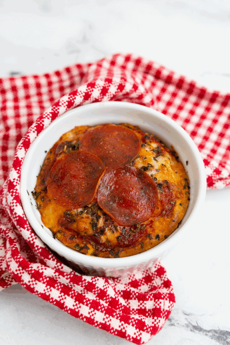 Air fryer mug pizza in a mug with melted cheese, sauce, and toppings