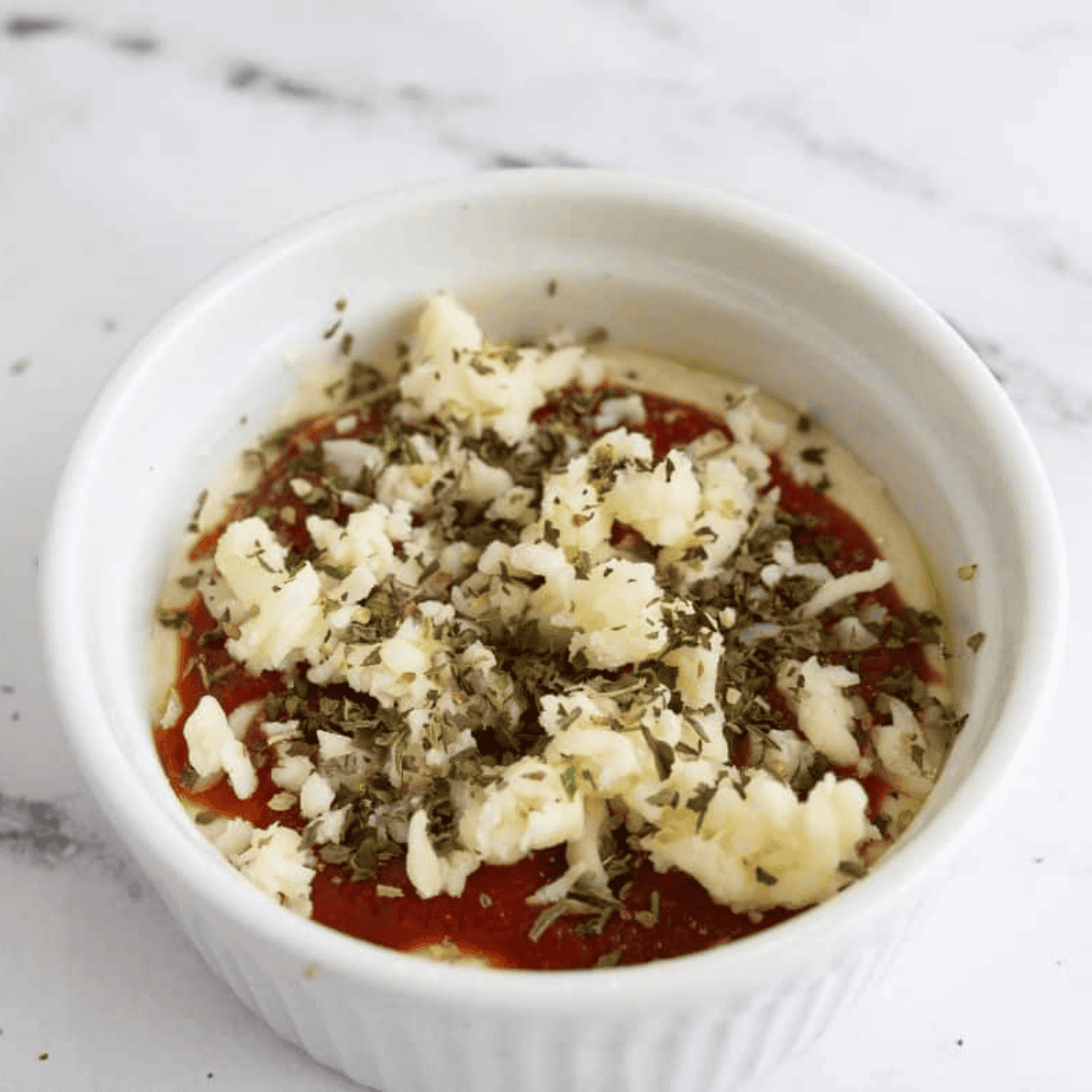 - Add the mixture to the mug, and then spoon the 1 tablespoon pizza sauce on top. Add the 1 tablespoon mozzarella cheese, 4-7 mini pepperonis, 1/2 teaspoon Italian seasoning, and 1/2 teaspoon dried oregano.