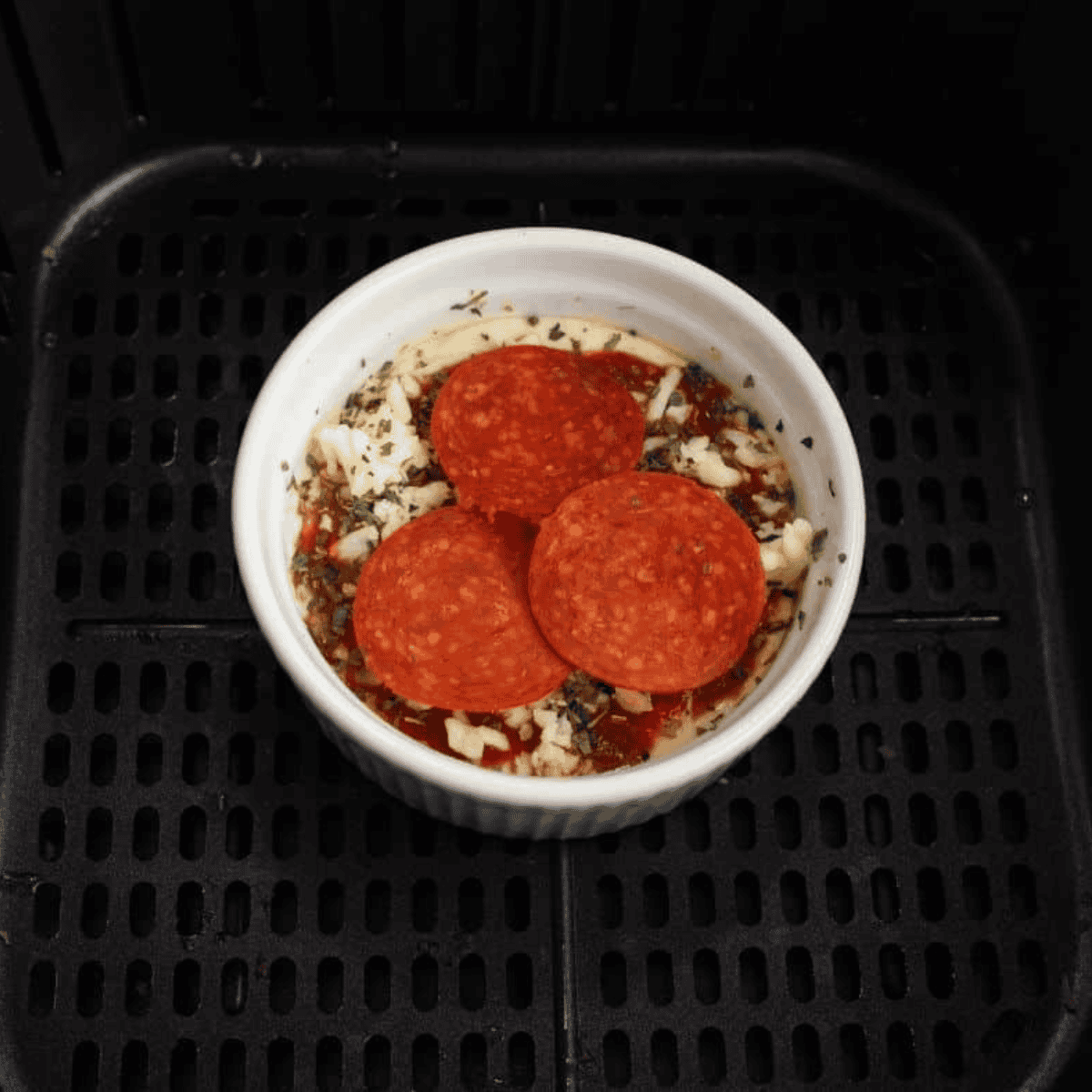 Step Five: Preheat your air fryer temperature to 375 degrees F (190°C), for 3-5 minutes. Place the mug or ramekin in the air fryer basket. Set cook time for 8-10 minutes or until the crust is golden brown and the cheese is melted and bubbly.