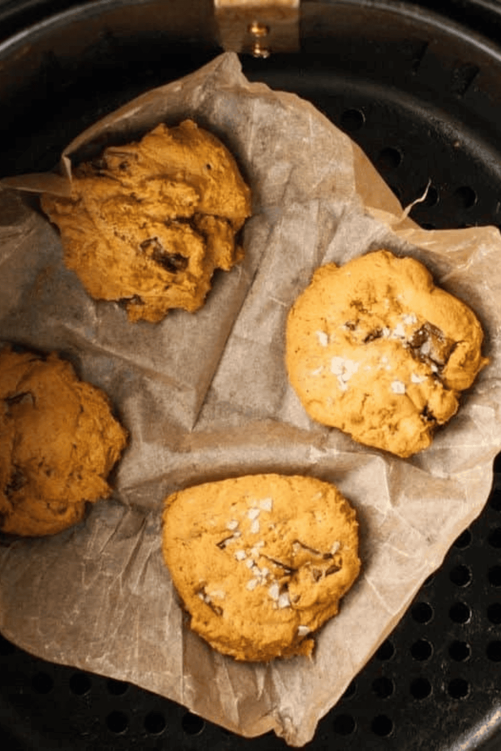 Step 3: Preheat the air fryer to 350°F and line the basket with parchment paper. Scoop the dough onto the parchment, flatten each cookie since they won’t spread much, and sprinkle with flaky salt if using.