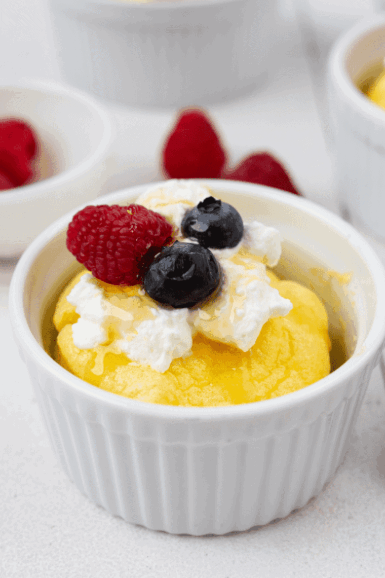 Step Three; Preheat your air fryer temperature to 250 degrees F (120°C) using the air fryer setting. Place the filled ramekins into the air fryer basket and cook for 8–10 minutes until puffed and cooked through. Top your soufflé pancakes with whipped cream, maple syrup, and fresh berries.