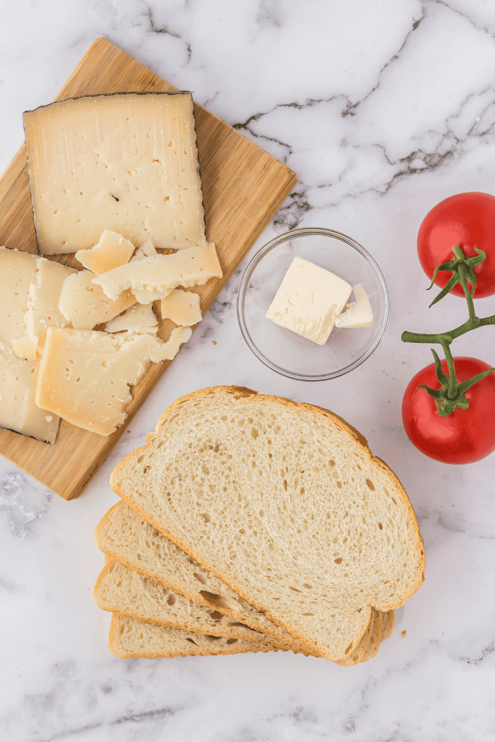 - While the air fryer is preheating, slice the 1 wedge Manchego cheese and place the cheese slices on two slices of bread. The Manchego cheese may break or crumble. This is okay, and you just need to make sure the entire face of the bread is covered with cheese.