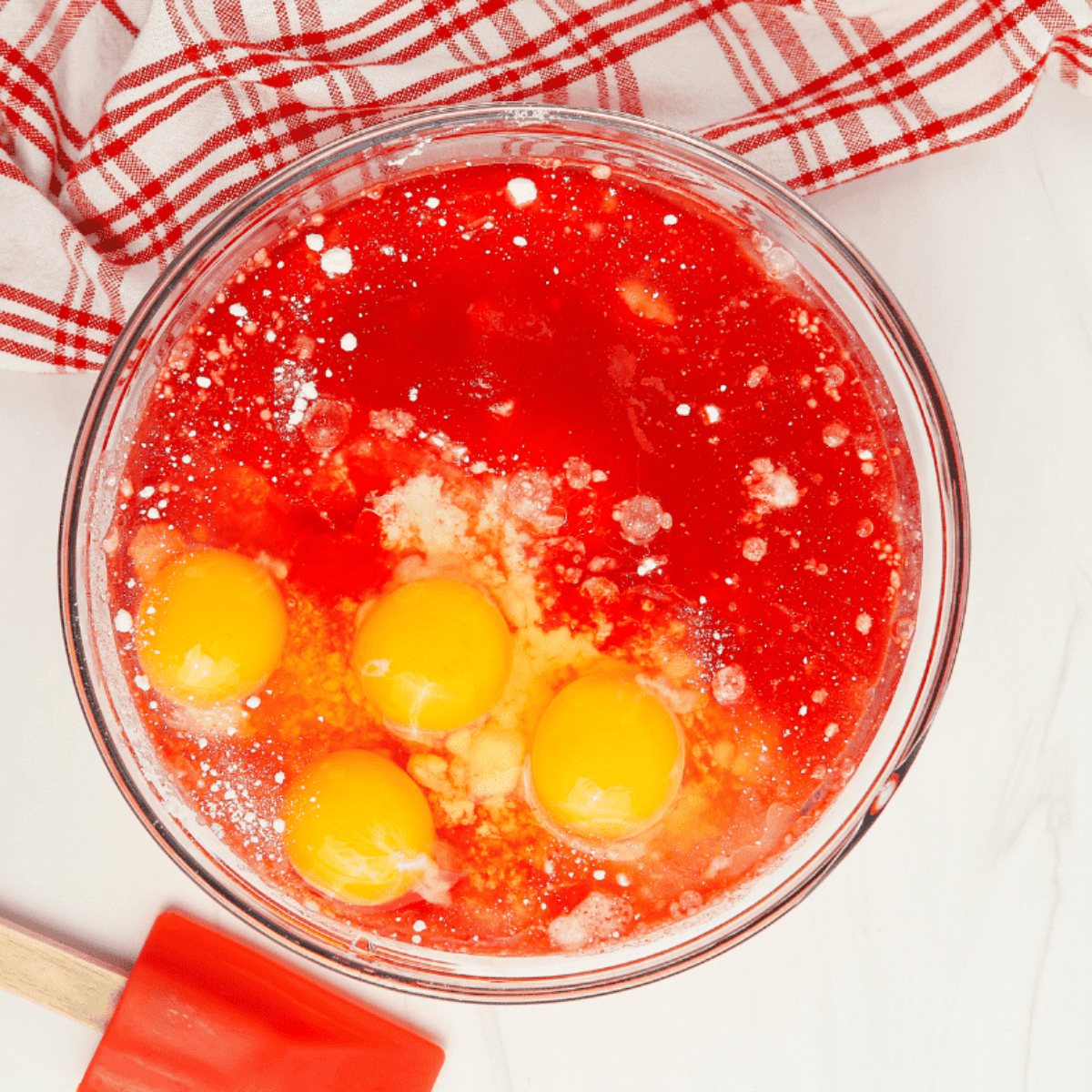 - Mix together the 15 ounces white cake mix, 3 ounces strawberry Jello, 4 large eggs, 1/4 cup strawberry jam, 1/2 cup vegetable oil, and 2 tablespoons wateruntil well combined.