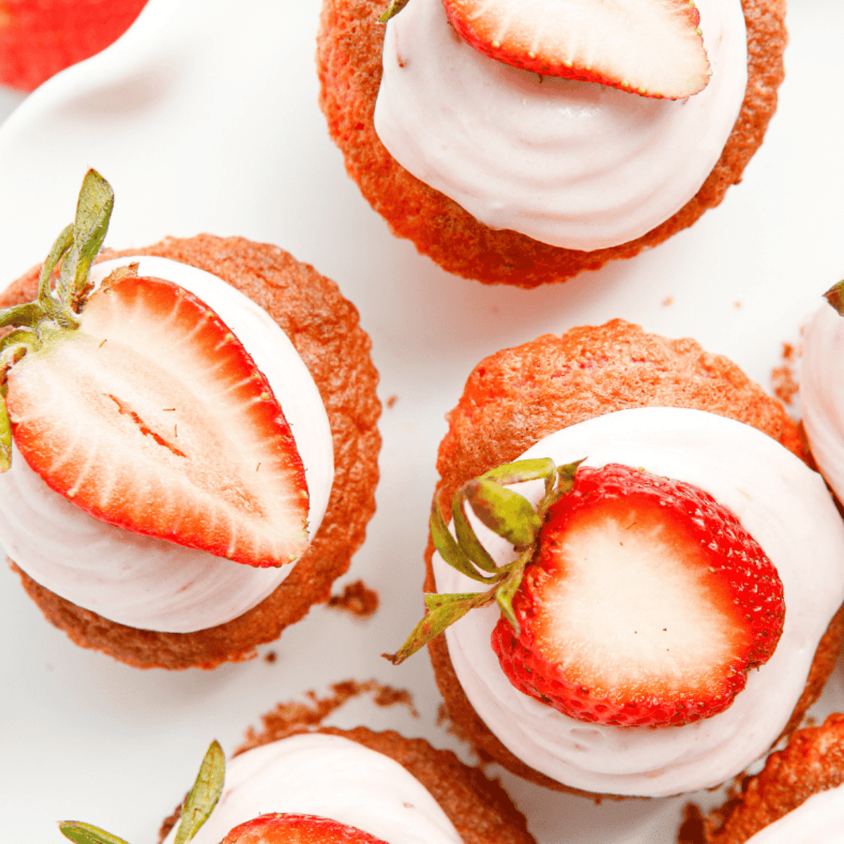 - Soft, fluffy cupcakes with fresh strawberry flavor.