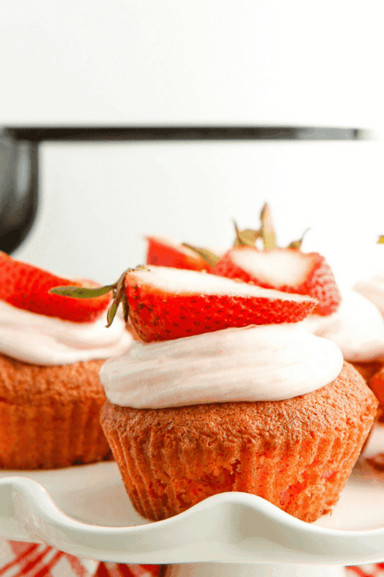 - Pipe or spread the strawberry cream cheese frosting across the cupcakes and top each with a sliced strawberry.