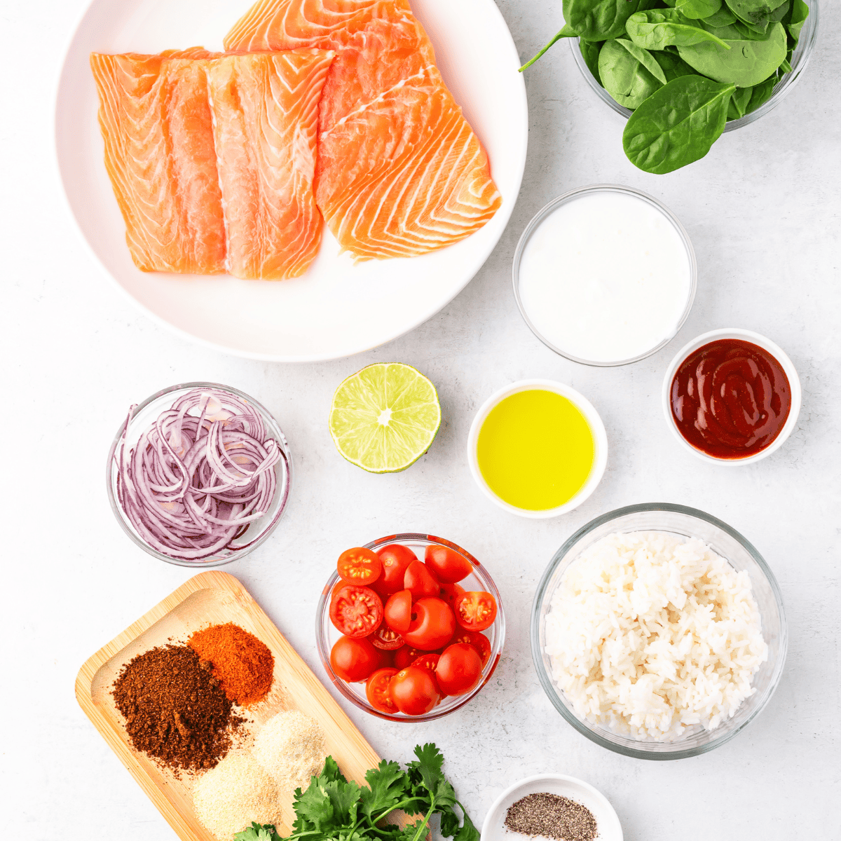 • Salmon Fillets: Fresh salmon fillets cut into bite-sized chunks