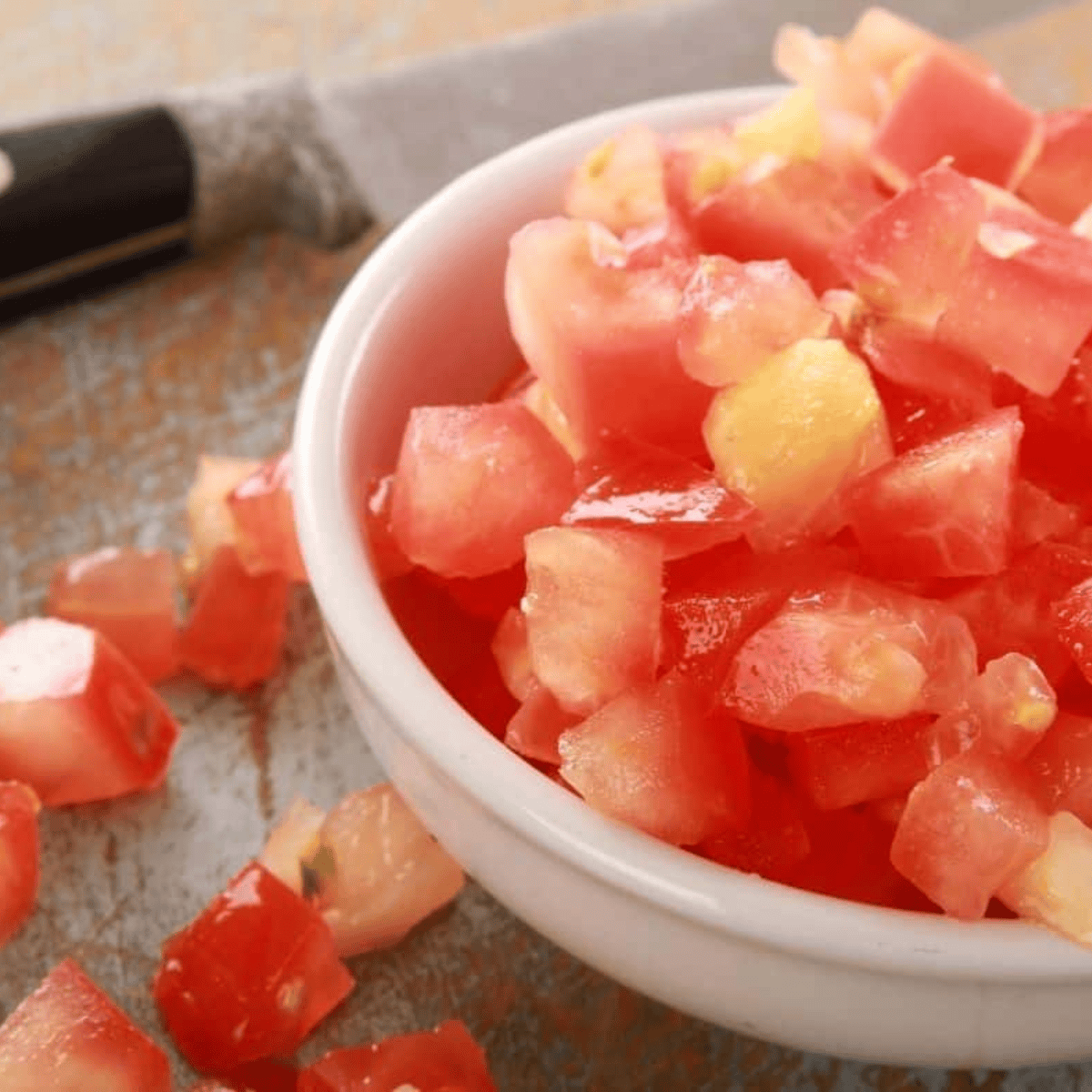 - Dice the tomatoes and mozzarella evenly so every bite stays balanced and nothing slides off the bread.