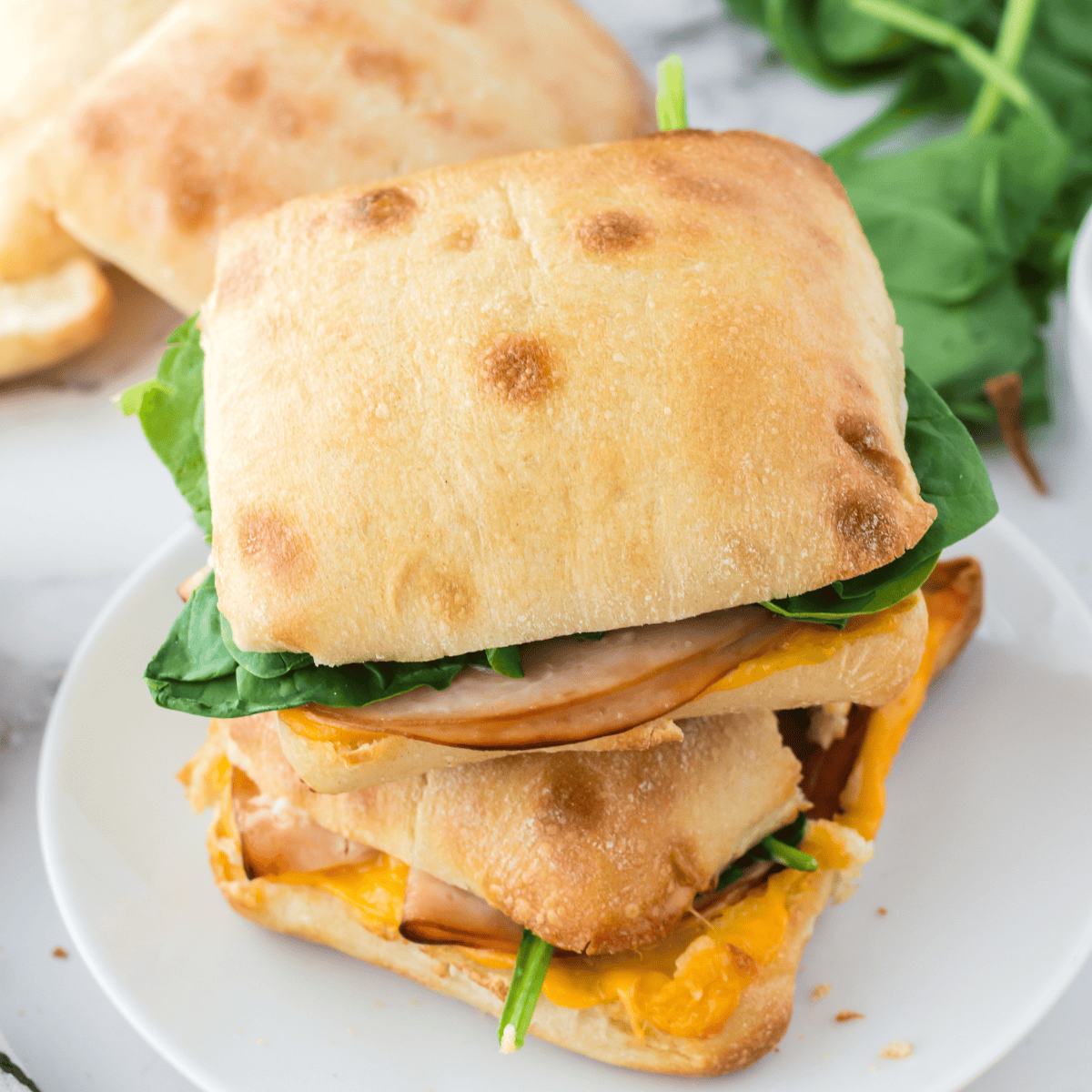 - Preheat your air fryer temperature to 350 degrees F for 3-5 minutes. While the air fryer is preheating, cut each 4 ciabatta buns in half and spread 2 teaspoons mayonnaise and 2 teaspoons mustard on each side of each slice of bread. Place a piece of cheese and two turkey slices on each sandwich.
