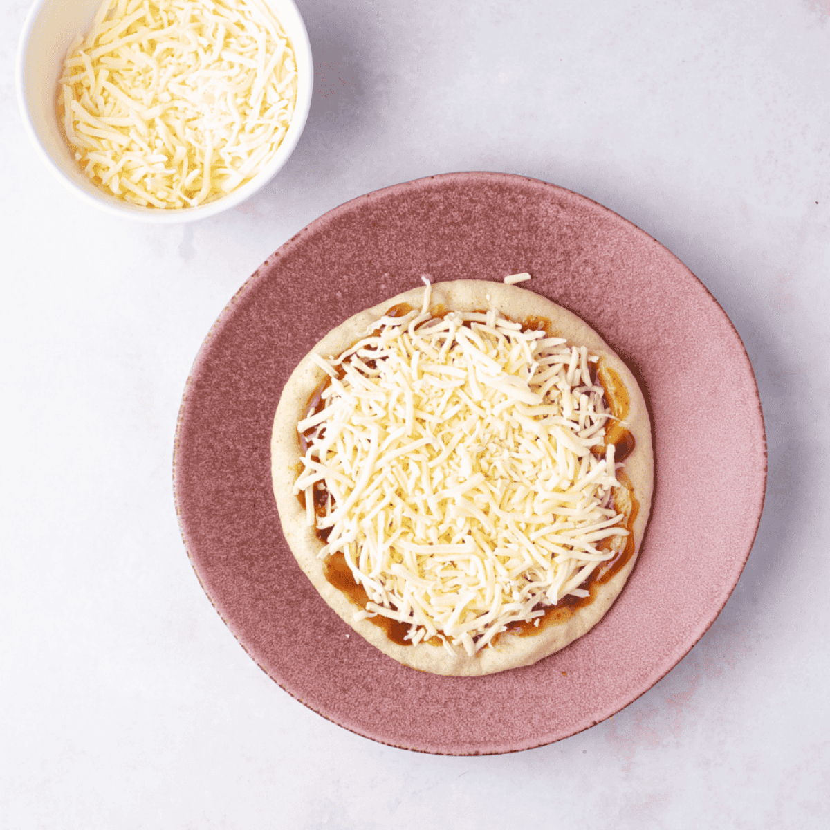 Step Four: Spread a thin layer of the seasoned tomato sauce over the top side of each pita bread, leaving a small border for the crust. Sprinkle a generous amount of shredded mozzarella cheese over the sauce.