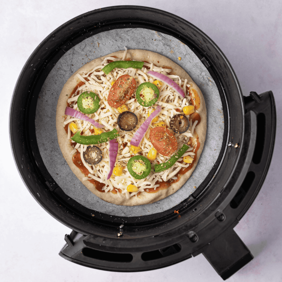 - Layer on your favorite sliced vegetables and any lean protein you choose to add. Keep in mind that air frying can cook toppings quickly, so choose ingredients that require minimal cooking time.