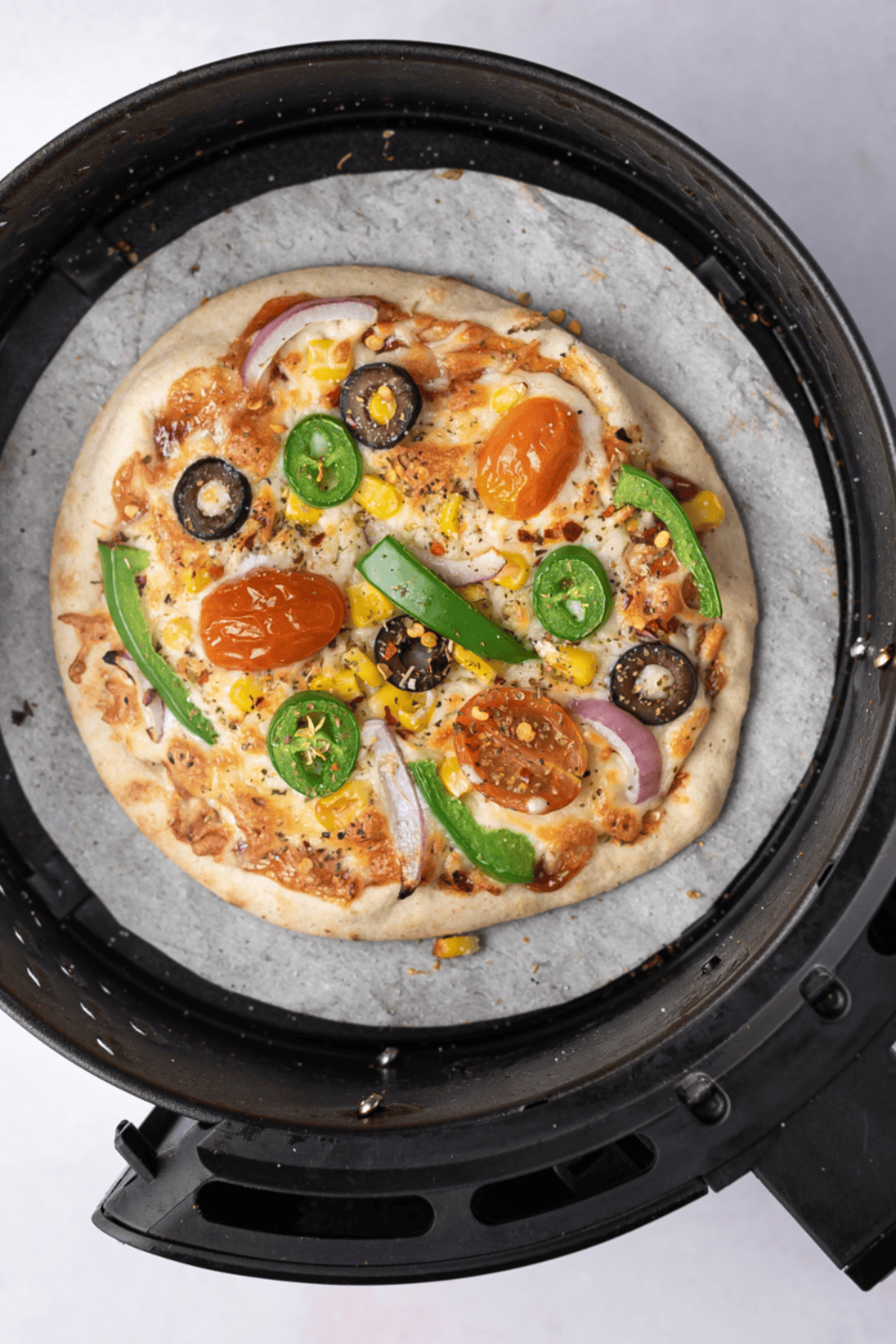 - Once the pita pizzas are done, carefully remove them from the air fryer. Sprinkle freshly chopped basil leaves and red pepper flakes (if using) on top for added flavor and visual appeal.