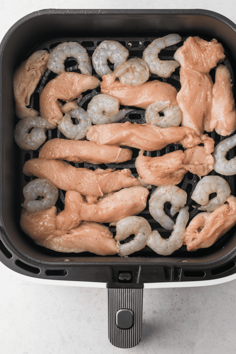 - Place the chicken and shrimp in the air fryer basket in a single layer. Cook for 8-10 minutes, flipping halfway, until the chicken is fully cooked and the shrimp are pink and opaque. Remove from the air fryer and set aside.