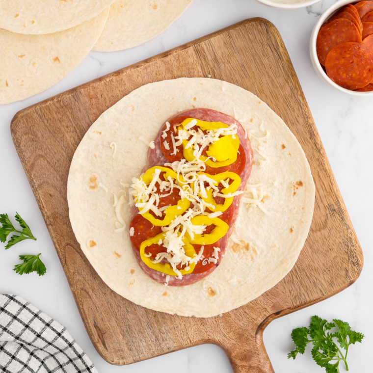 - Lay a tortilla flat. Layer deli meats, provolone, shredded mozzarella, and optional veggies. Sprinkle with Italian seasoning.
