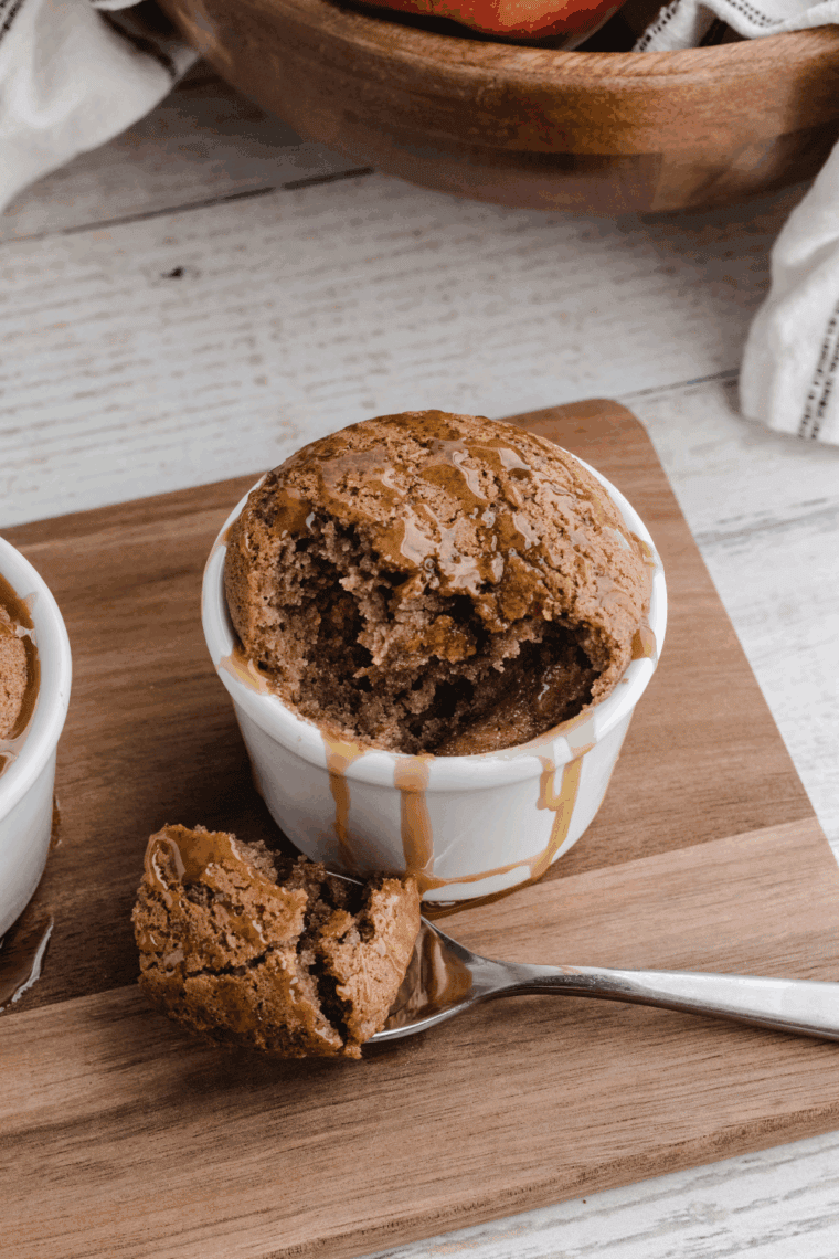 Air fryer salted caramel apple mug cake in a mug with caramel drizzle