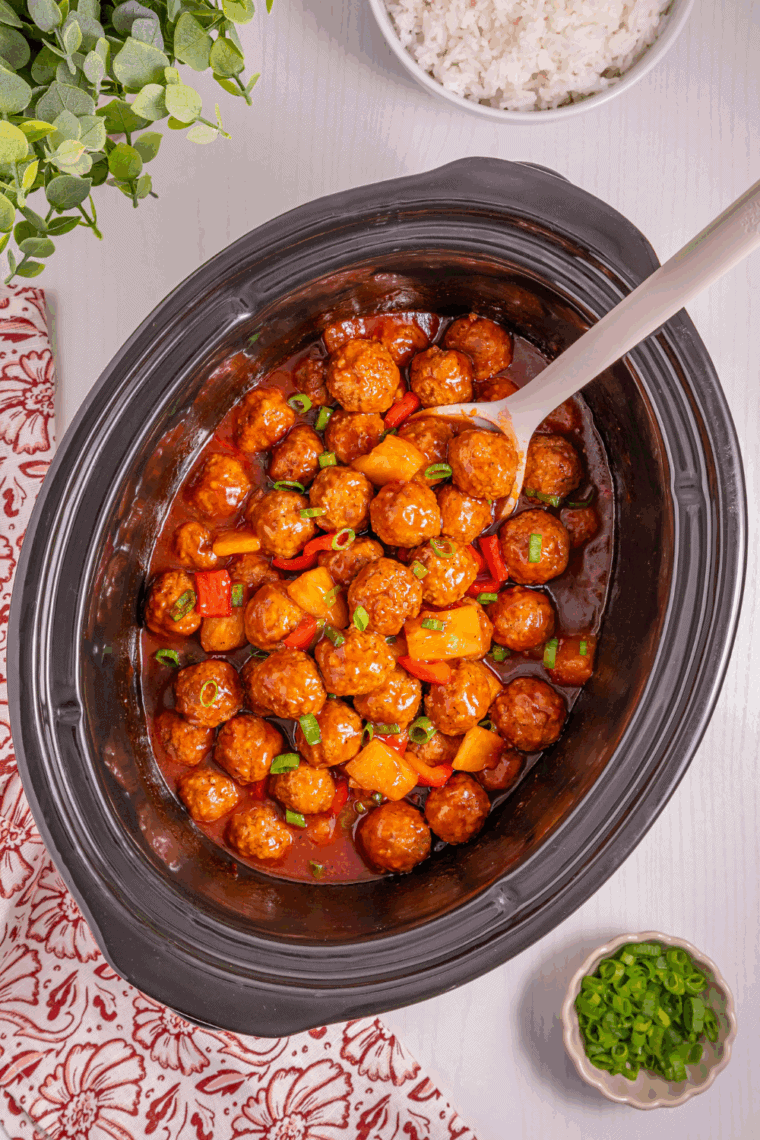 Made in the slow cooker, the meatballs soak up a deliciously sweet and tangy sauce with pineapple and soy sauce, creating the ultimate comfort food that’s perfect for dinner, game day, or gatherings.