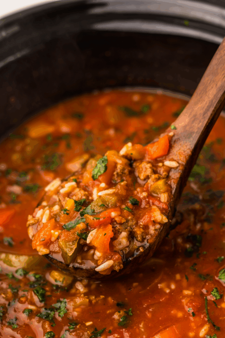 Bowl of easy slow cooker stuffed pepper soup with ground beef, bell peppers, tomatoes, and rice, garnished with herbs.