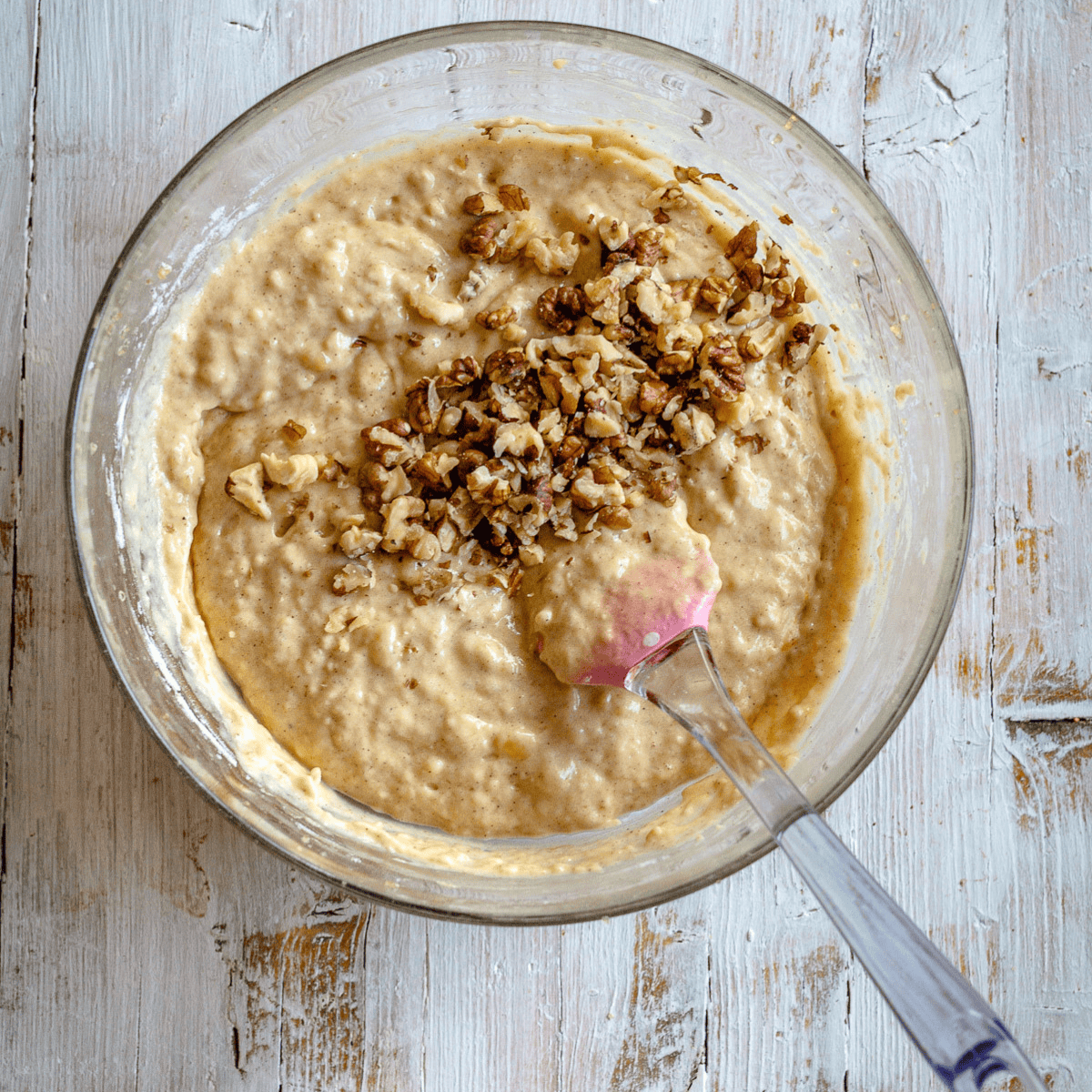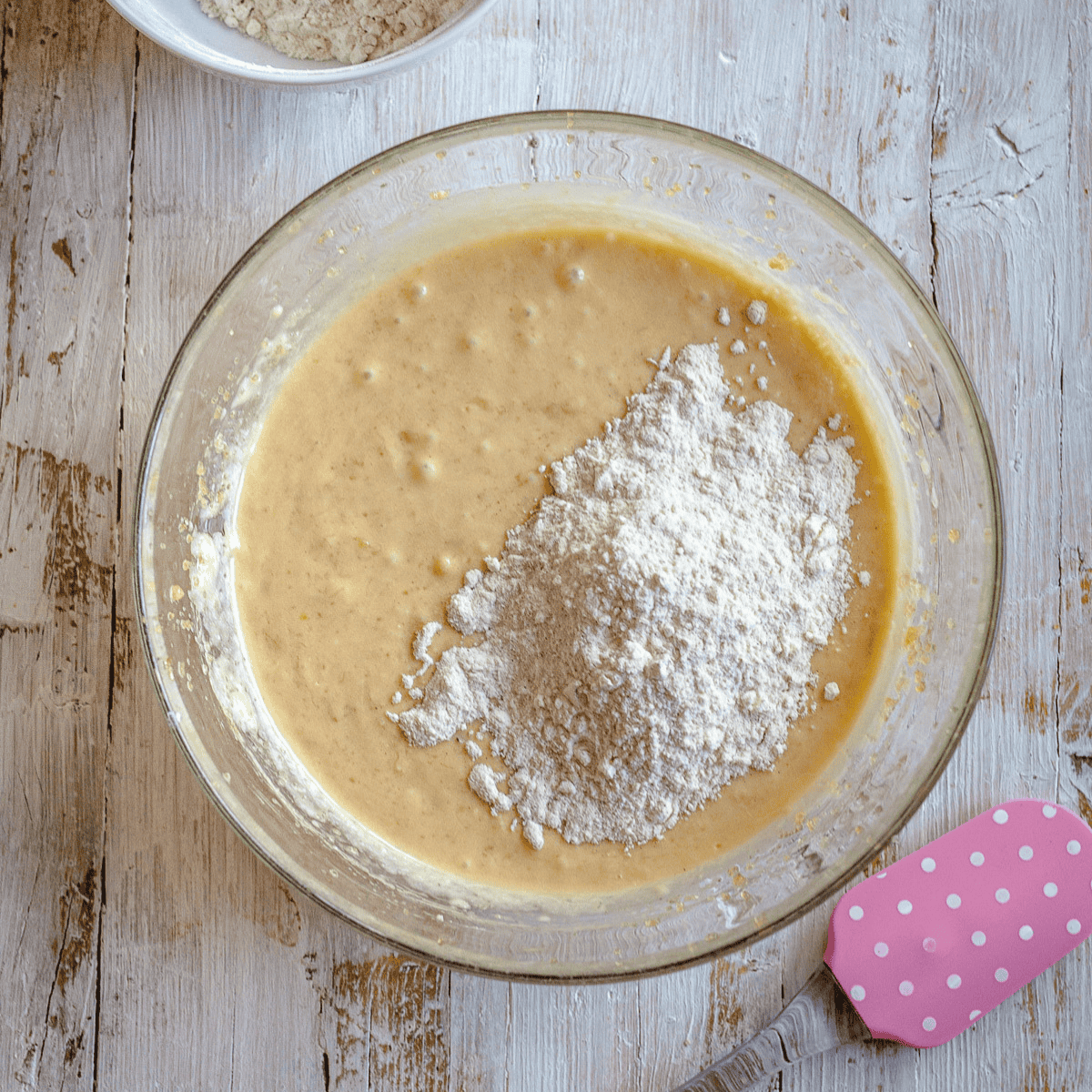 - Now mix thoroughly until all ingredients are incorporated. After each mixing stage, scrape down the bowl so you can check for any stray chunks or untouched bits at this point!