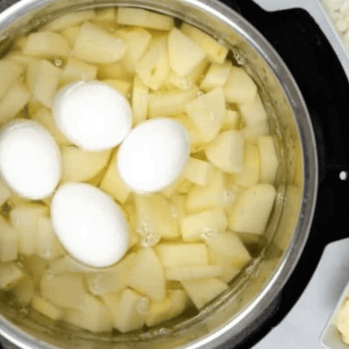 Step One: Peel and cube potatoes into 1-2 inch cubes. Place the potatoes in the Instant Pot. Add enough water to cover the potatoes, then add the salt. Place the eggs in the Instant Pot on top of potatoes and close the lid. Make sure the pressure value is set to close. Set the instant pot to pressure cook for 0 minutes on high pressure.