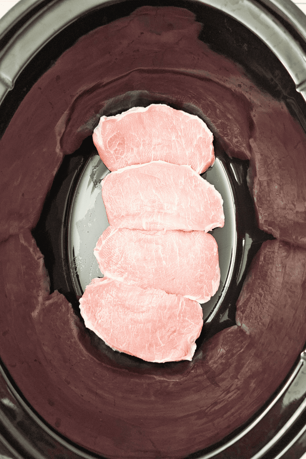 - Add the 4 boneless pork chops to the bottom of the crockpot.