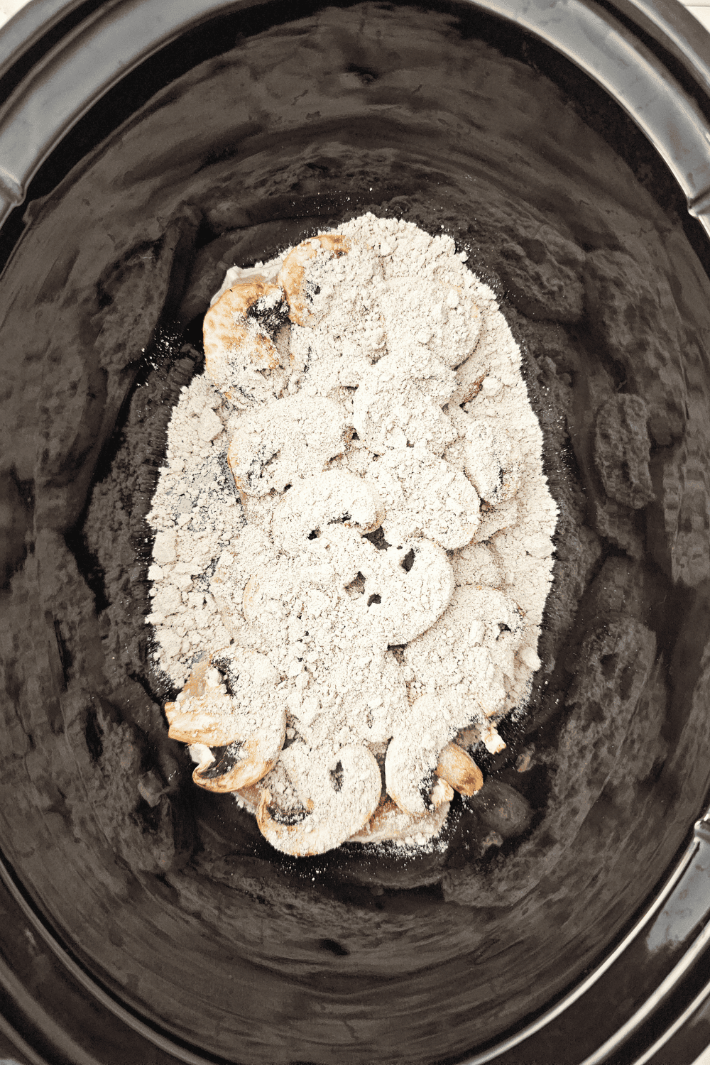 Step Two: Layer the mushroom slices evenly on top of the pork. Sprinkle the brown gravy mix over the mushrooms, then pour in the water to create the cooking base.