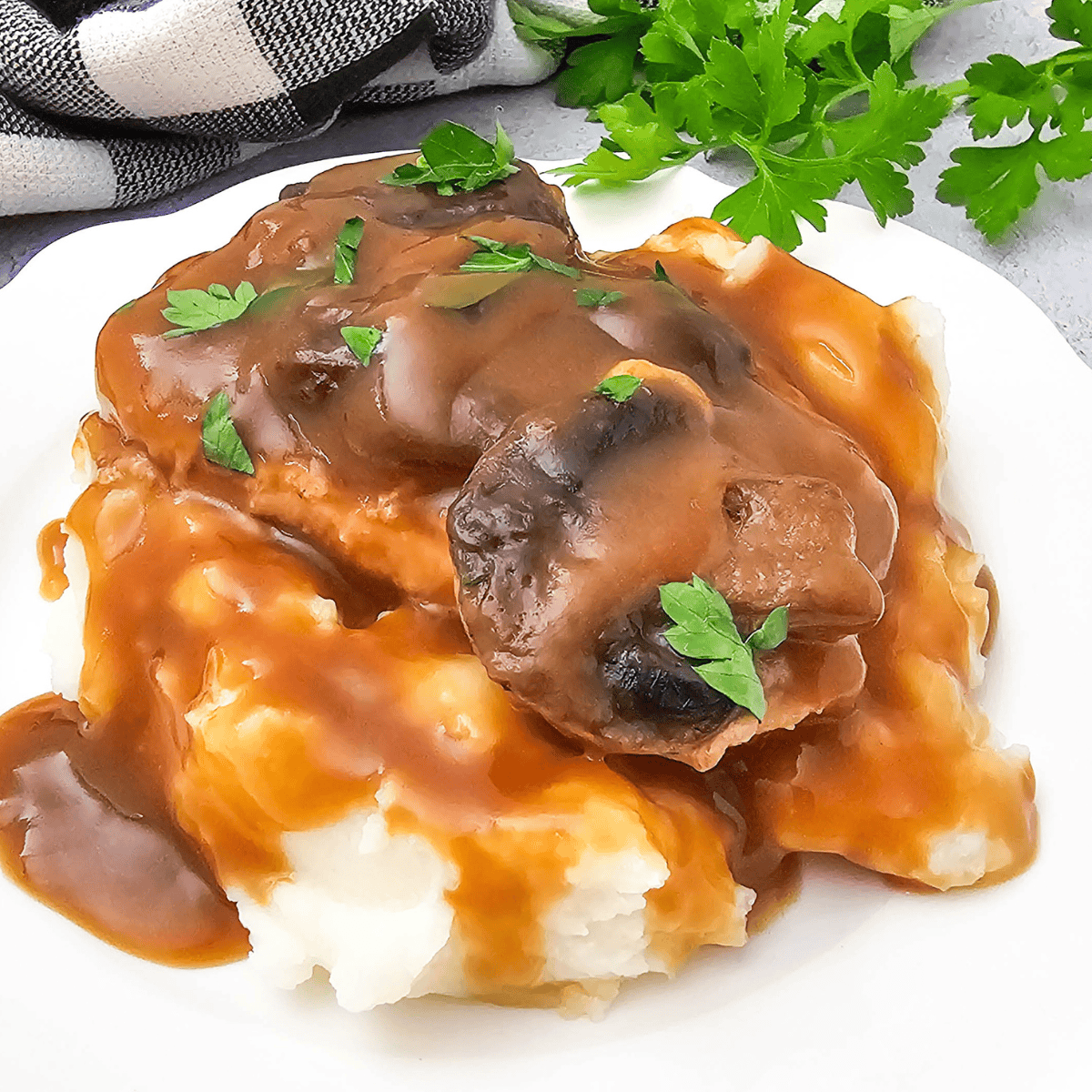 Step Three: Cover and cook on low for 4-6 hours until the pork chops are tender and flavorful. When done, chop fresh parsley and sprinkle over the pork chops before serving. Serve alone or over creamy mashed potatoes. For thicker gravy, prepare an extra gravy packet fresh before serving.