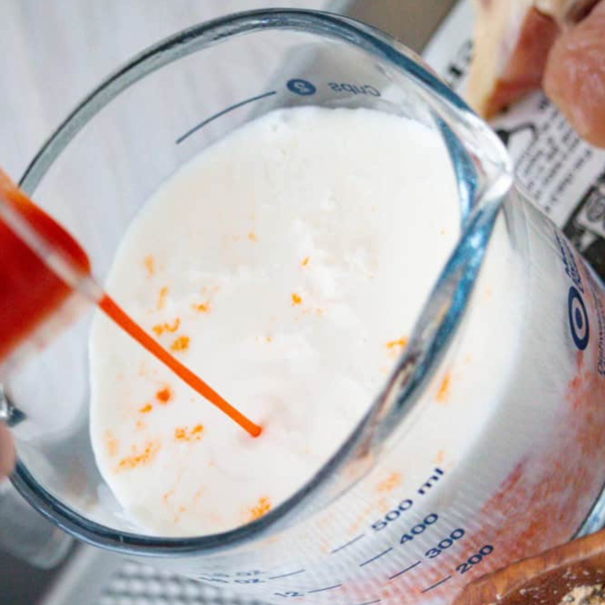 - Add the 1/4 cup hot sauce and 1 1/2 cup buttermilk to a large bowl, and mix well until combined. Add in half of the seasonings.