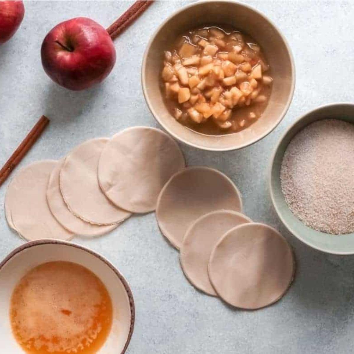 - In a small bowl, whisk together the sugar and ground cinnamon, set aside. Remove the biscuit dough from the can and separate it into 15 to 16 layers. With the help of a rolling pin, roll them out, so you have even circles about 5 inches each. Spoon 1 tablespoon of pie filling into the middle.