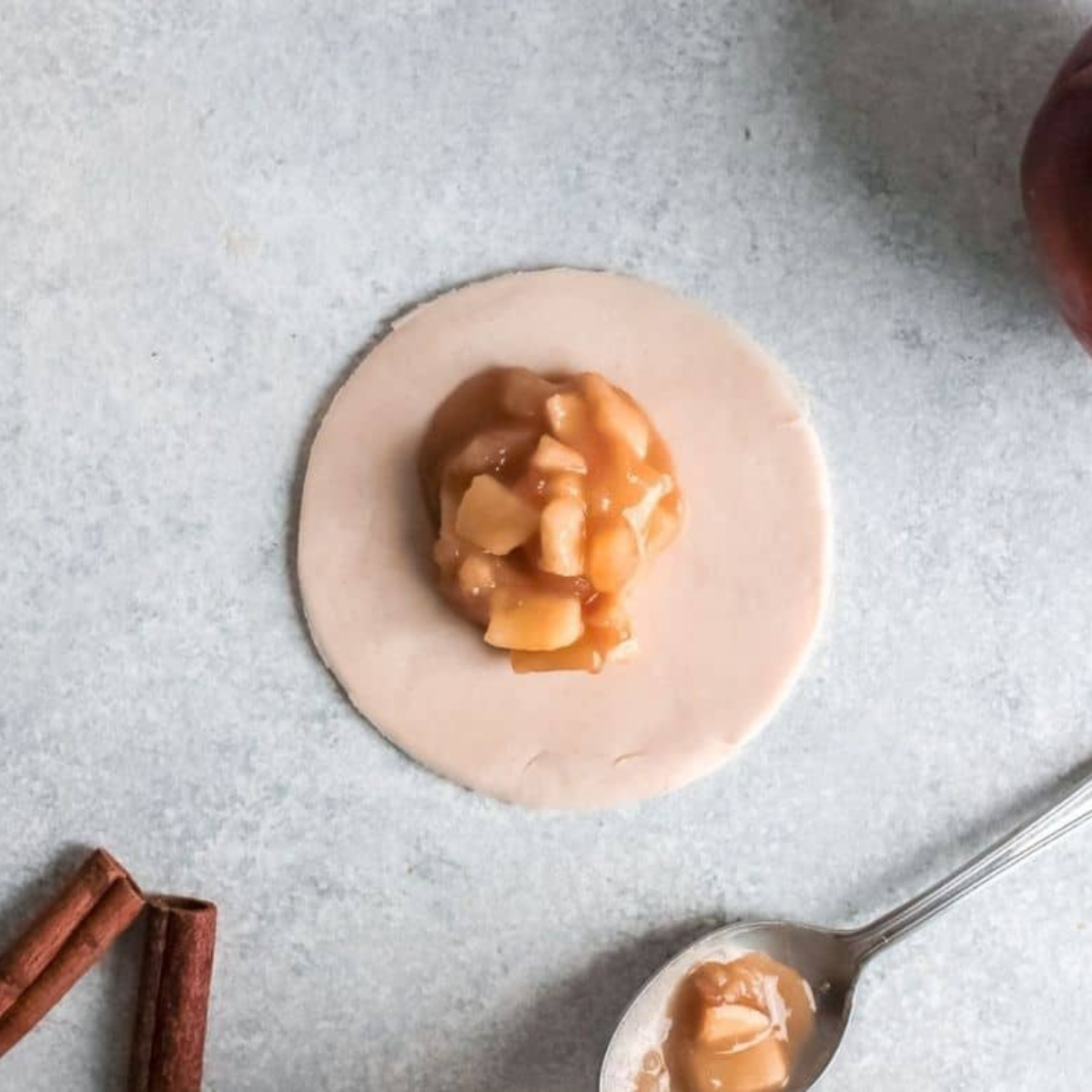 Step Two: With the help of a rolling pin, roll them out so you have an even 4-inch circle. Spoon 1 tablespoon of the apple pie filling into the center of each circle.