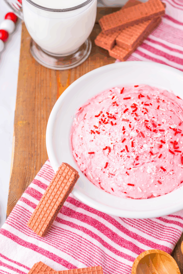 - Transfer the fluff to your serving bowl, sprinkle with Red and white sprinkles, and serve alongside Chocolate wafer cookies for dipping.